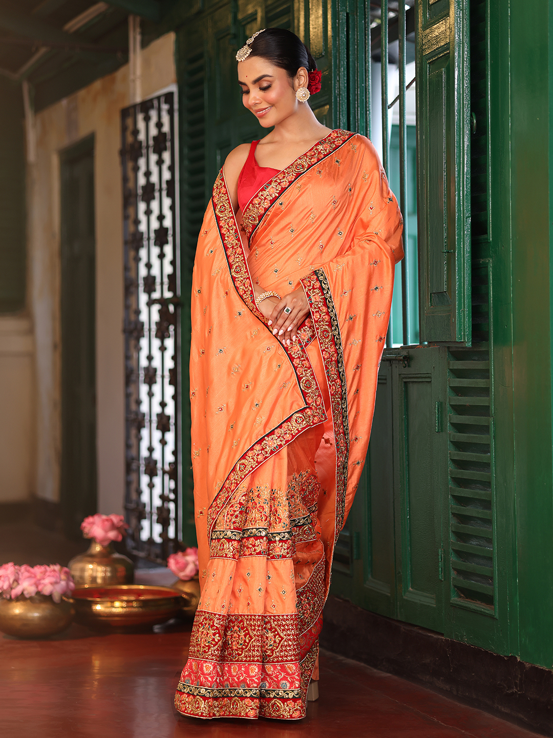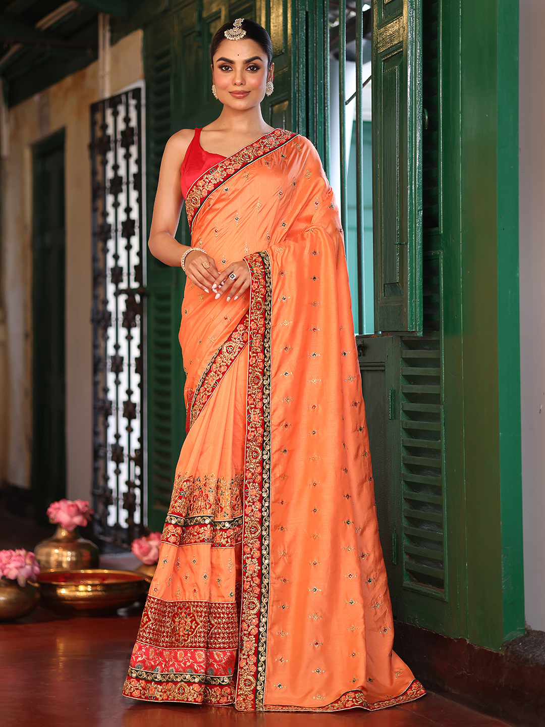Peach Color Designer Silk Blend Fabric Saree For Ceremonial Looks