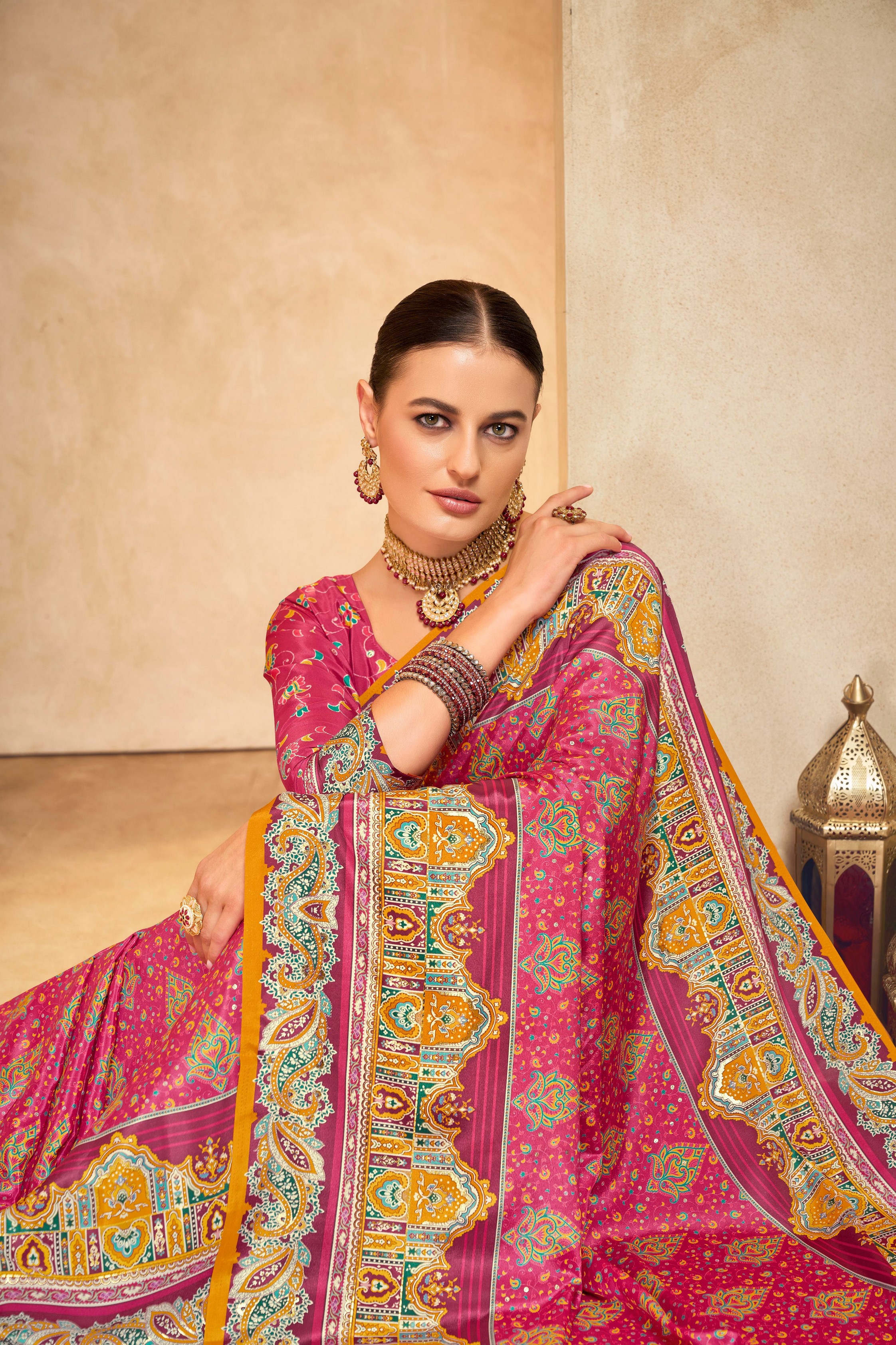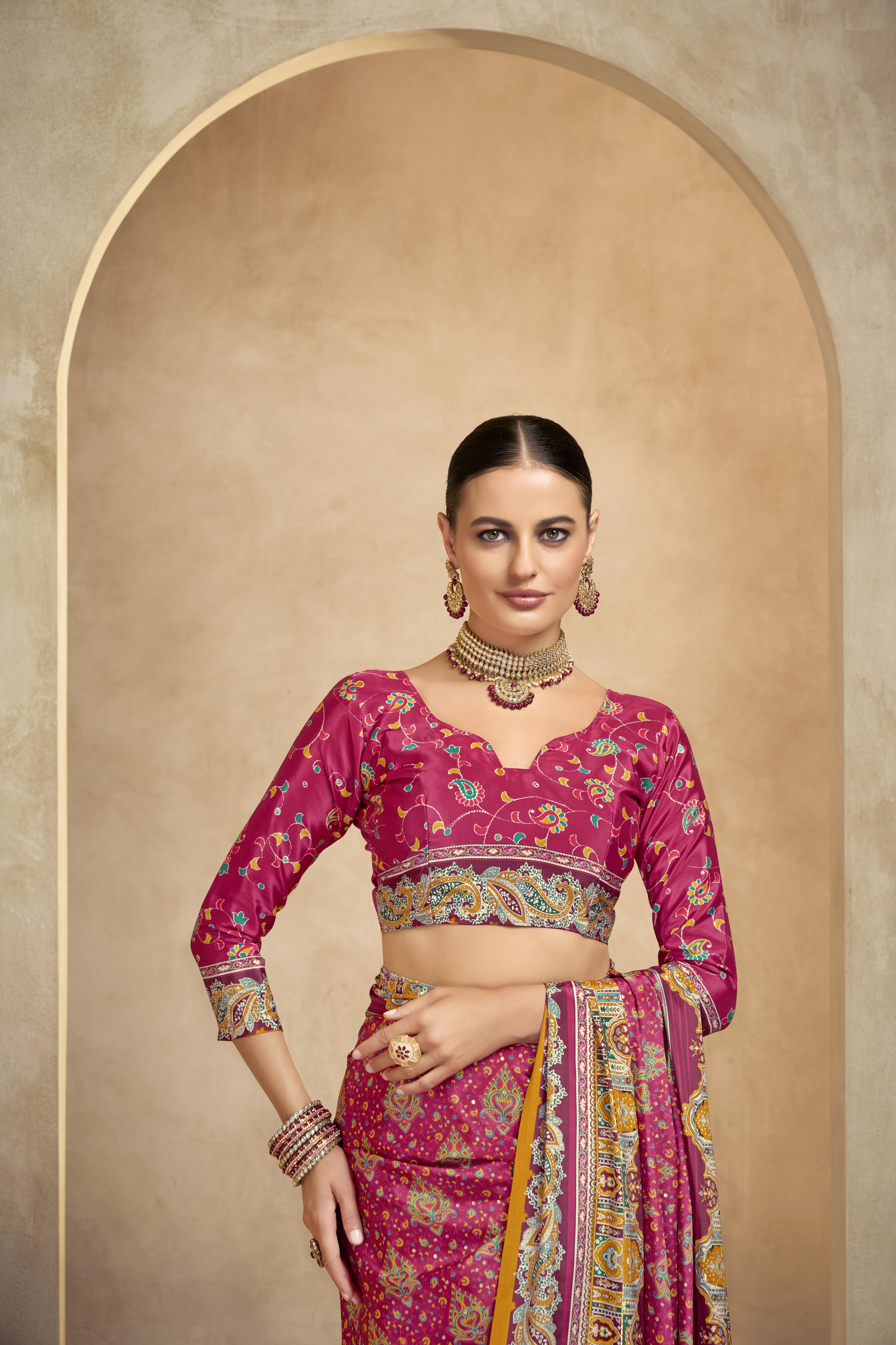 Pink Color Crepe Silk Fabric Position Digital Foil Printed Saree