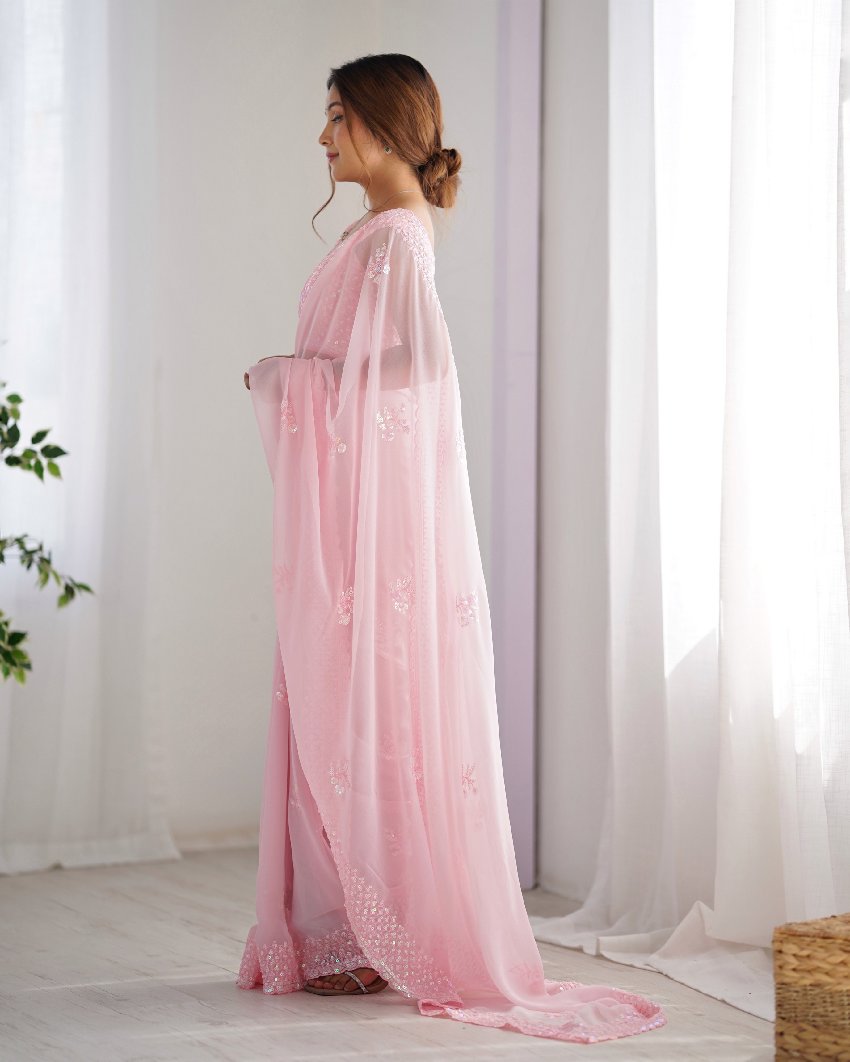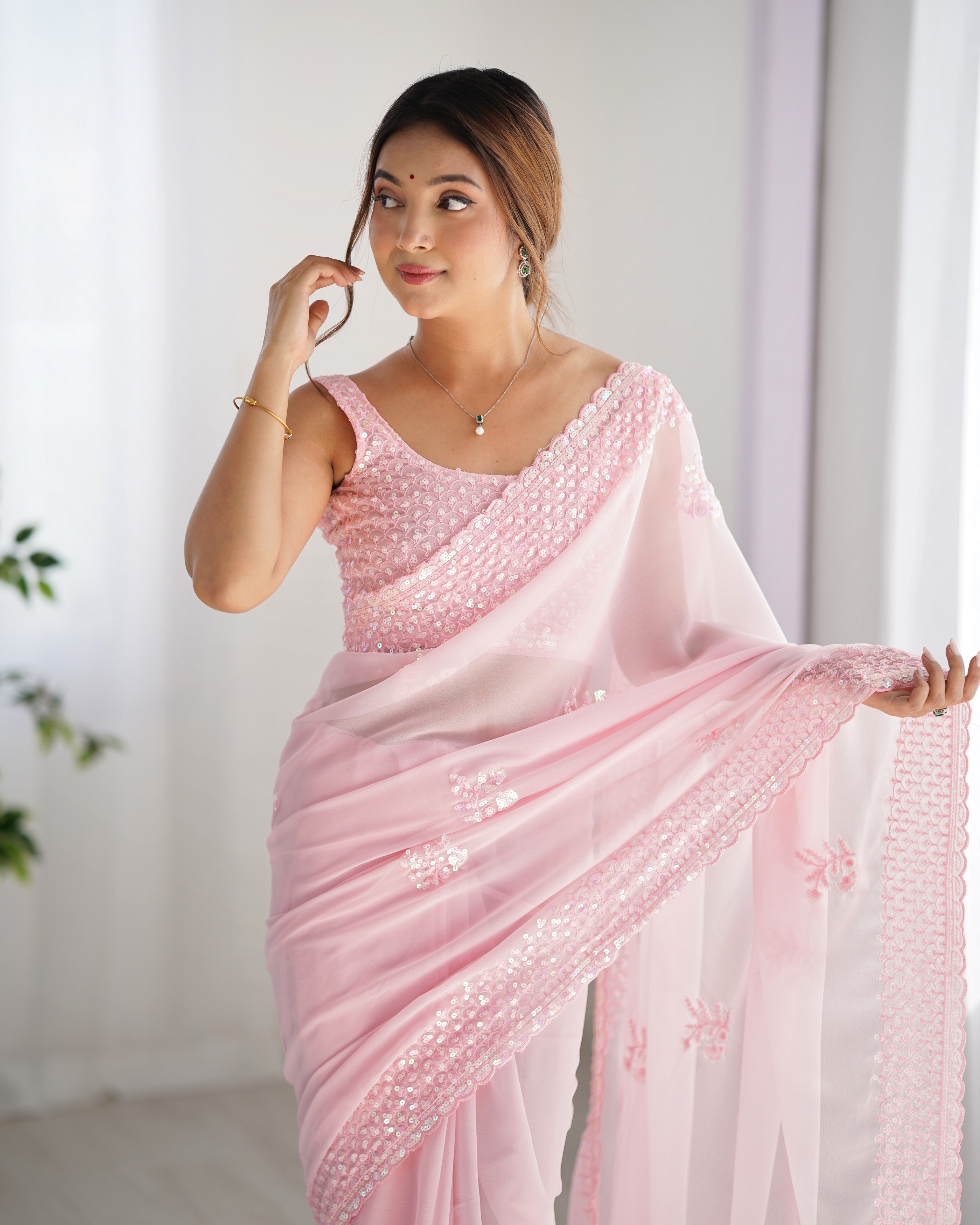 Pink Color Smart And Sparkling Bollywood Party Style Sequins Work Saree