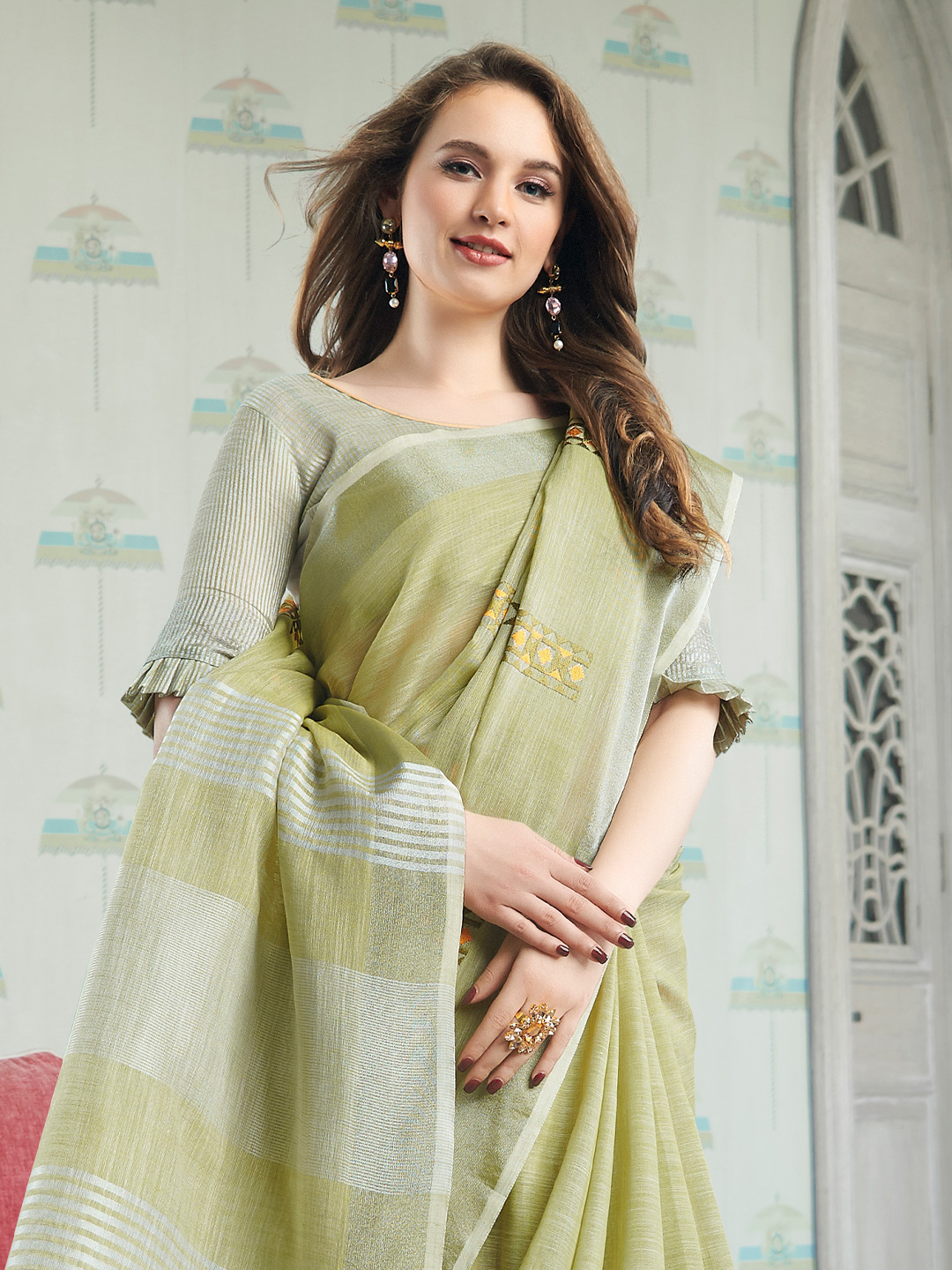 Pista Green Color Linen Fabric Sophisticated Floral Embroidered Saree
