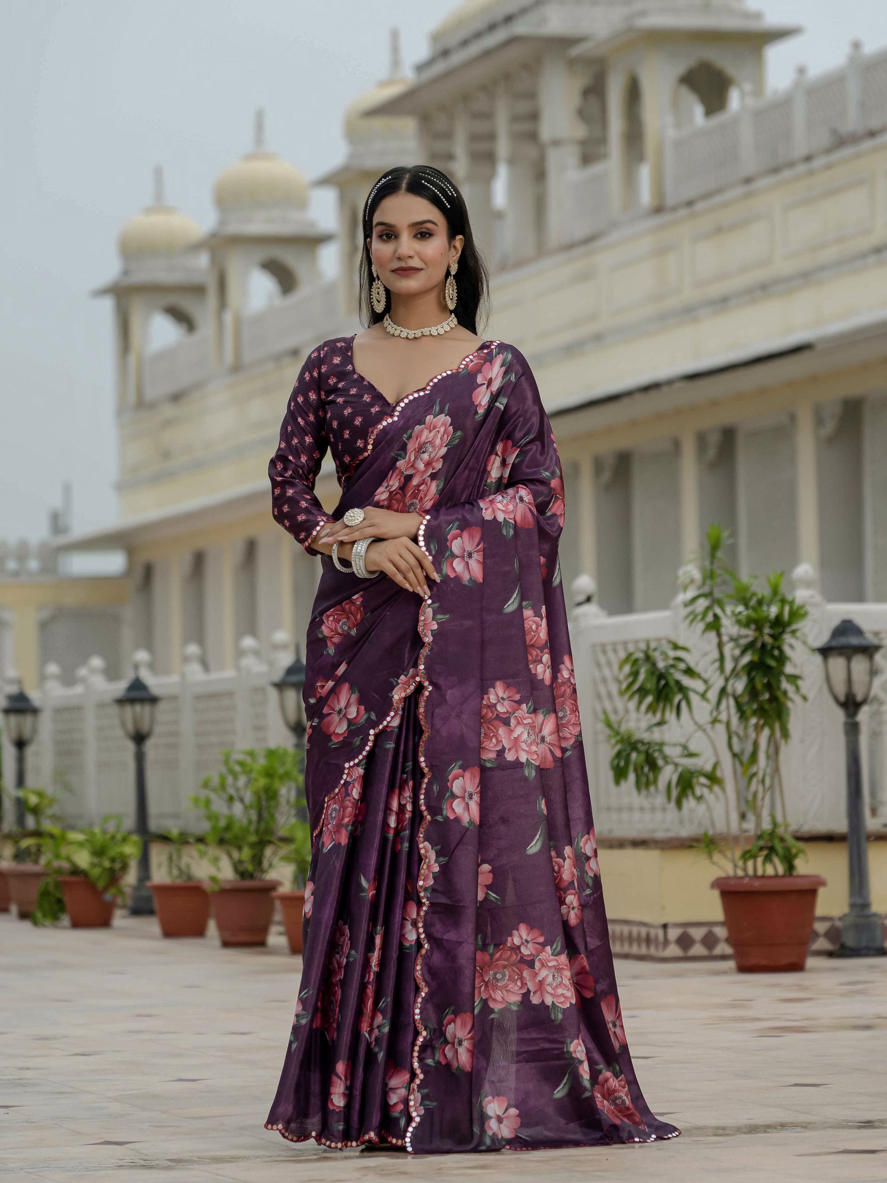 Purple Color Stylish Ready To Wear Chinon Fabric Partywear Saree