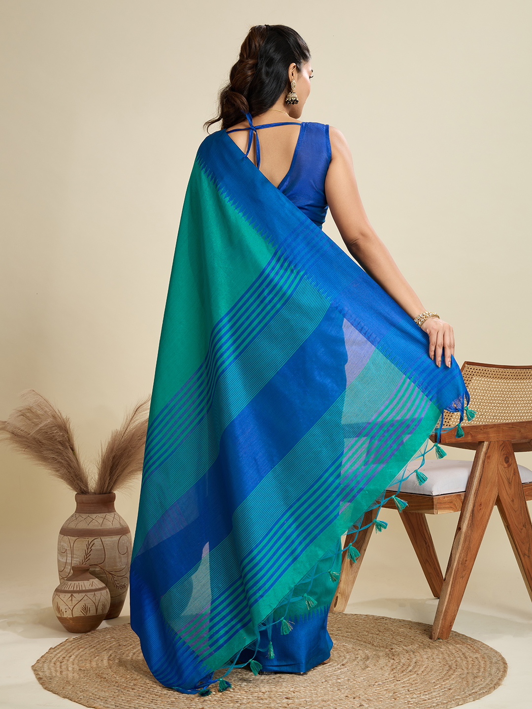 Rama Color Khadi Raw Silk Wevon Pallu Border Designer Ethnic Festive Wear Saree
