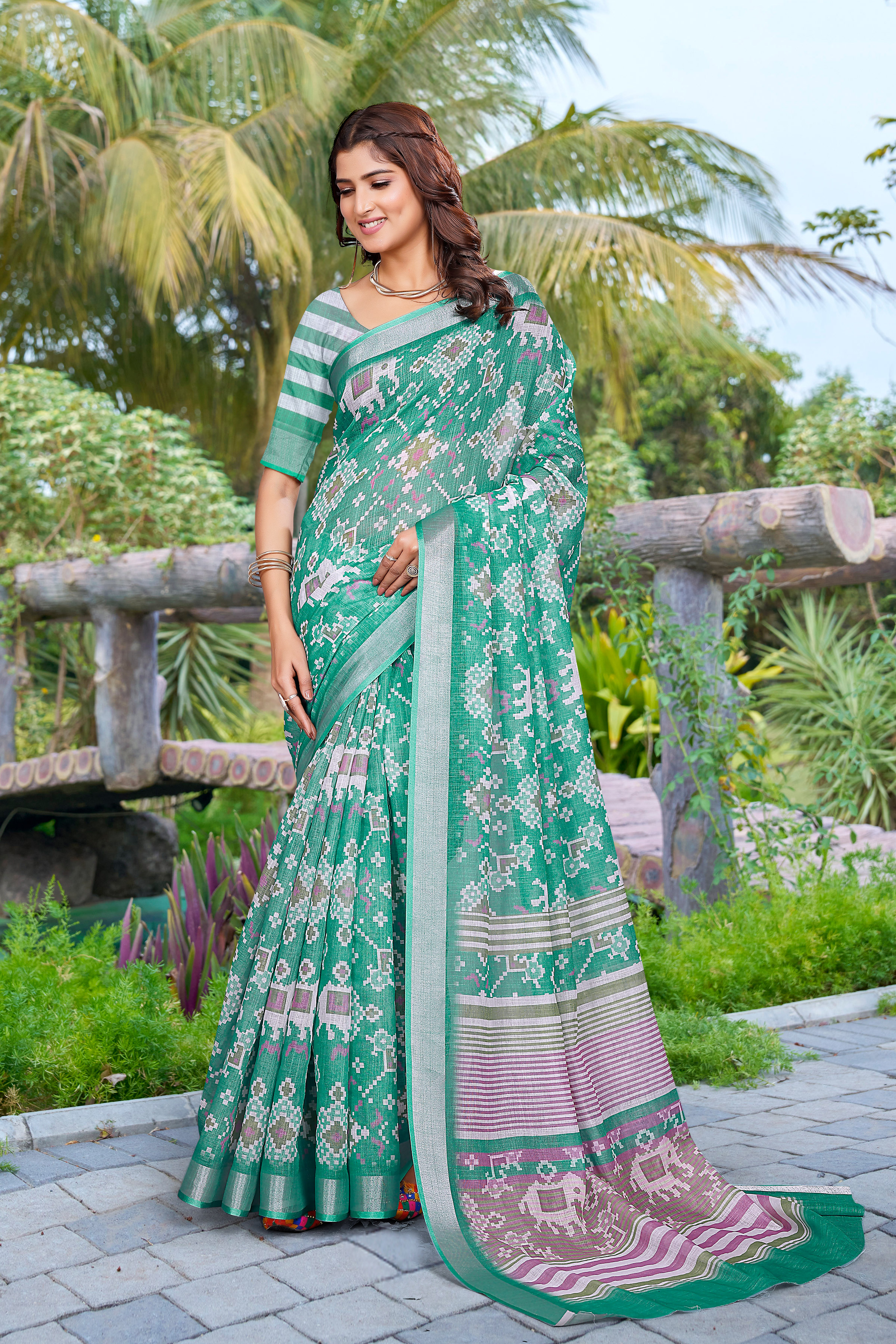 Rama Color Linen Cotton Saree With Smart Partywear Printed Looks