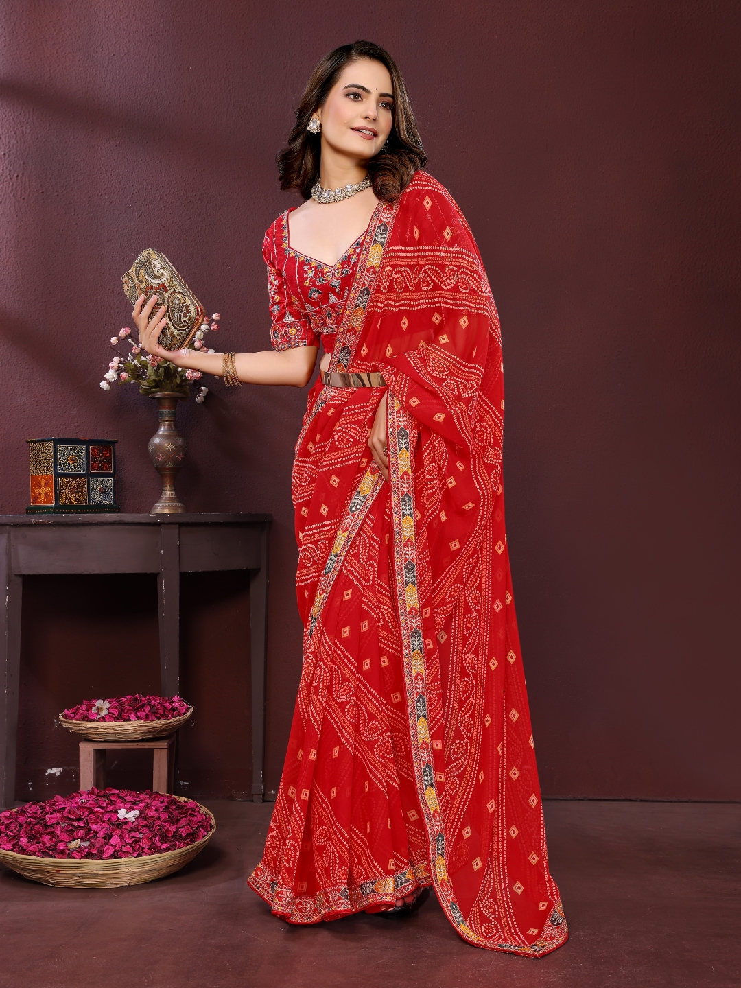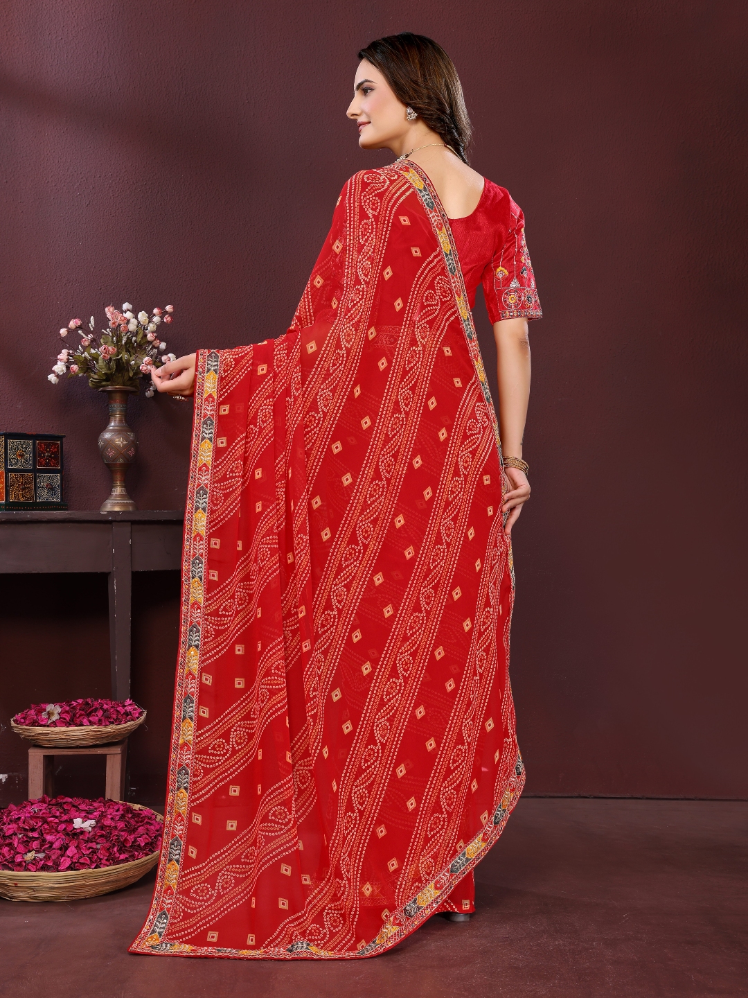 Red Color Georgette Fabric Bandhej Printed Traditional Saree