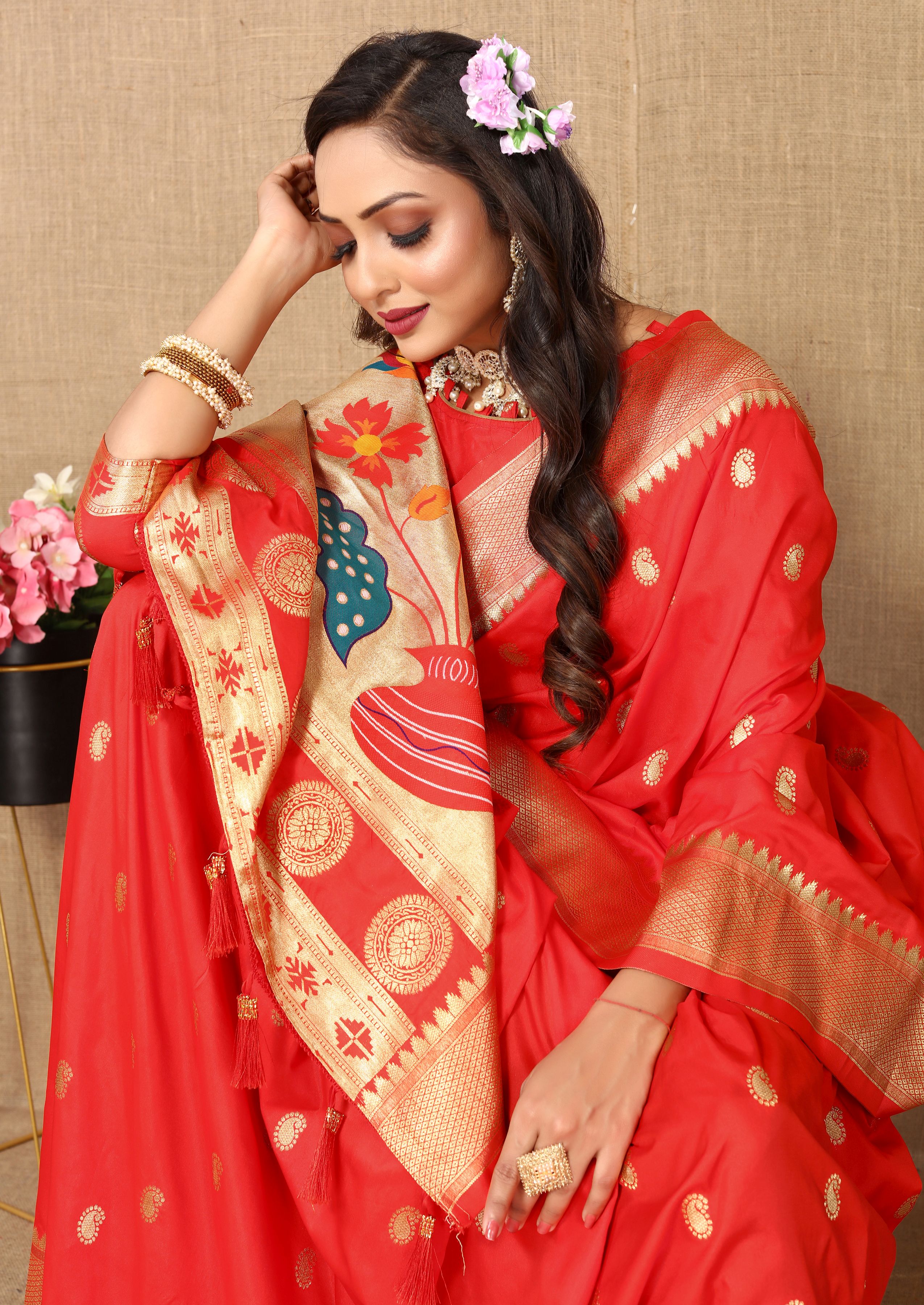 Red Color Paithani Silk Woven Meenakari Jacquard Designer Traditional Rich Ethnic Saree