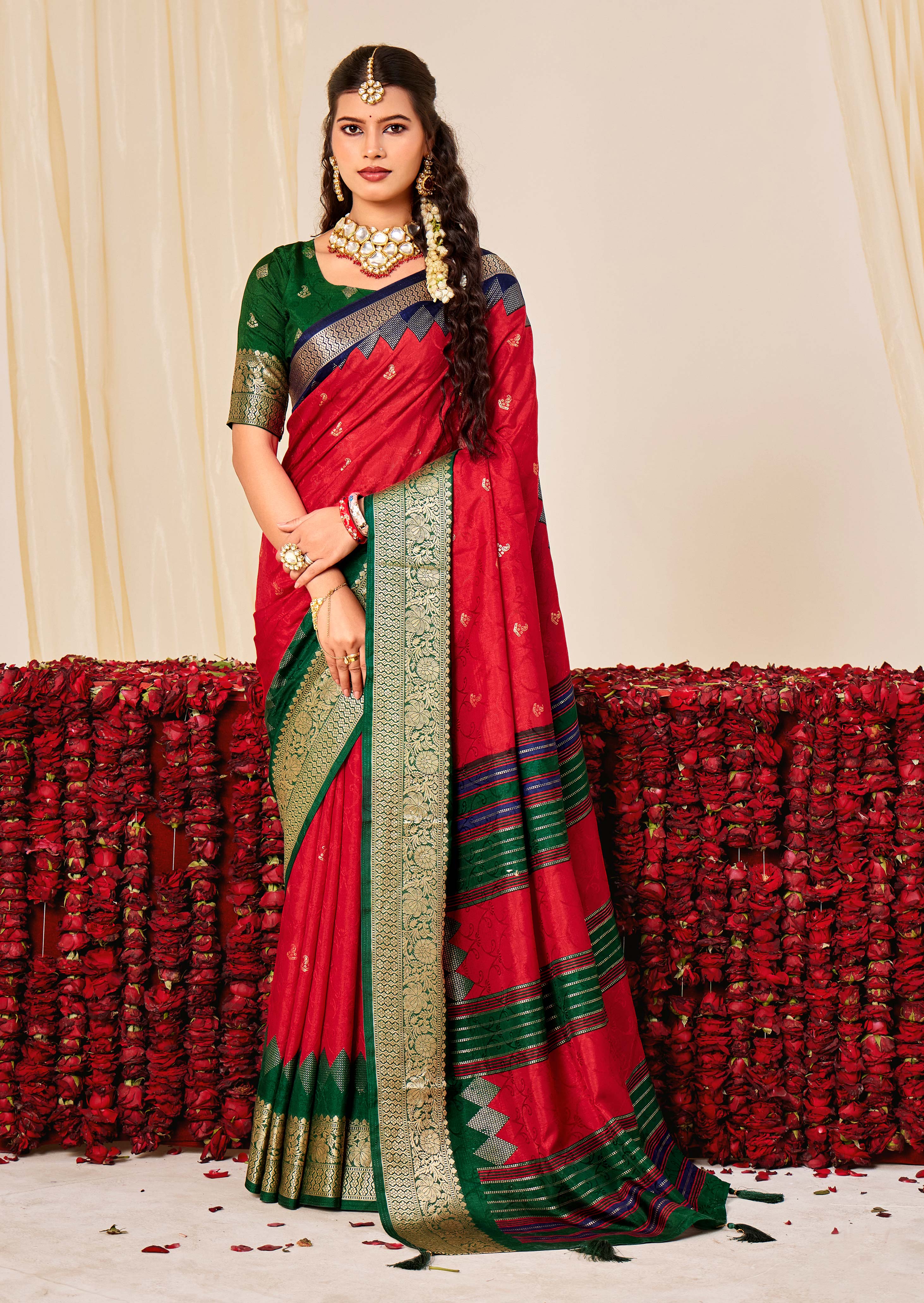 Red Color Velvet Tussar Silk Fabric Woven Saree With Smart Elegant Print