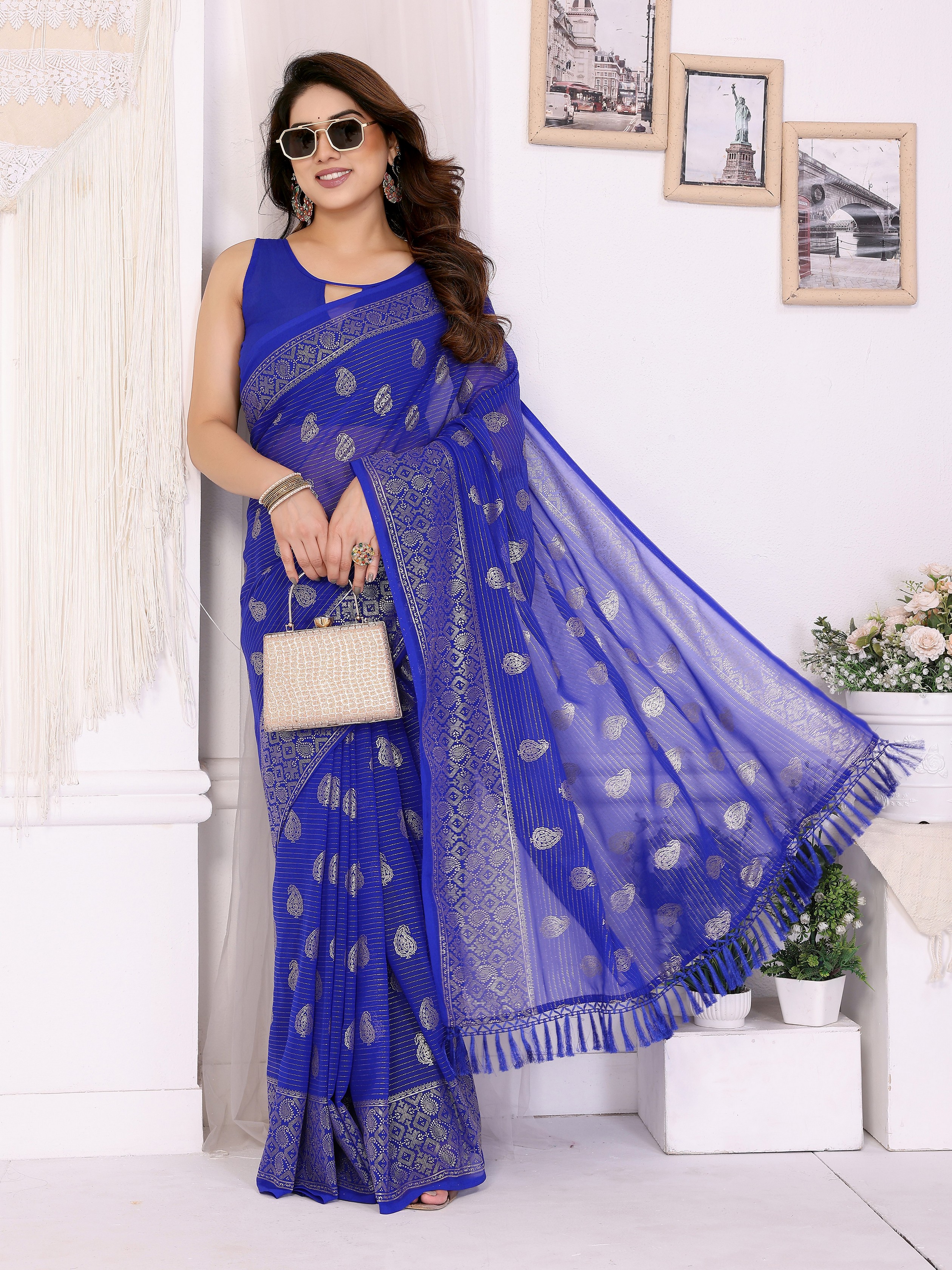 Royal Blue Color Georgette Fabric Designer Foil Printed Ceremonial Saree