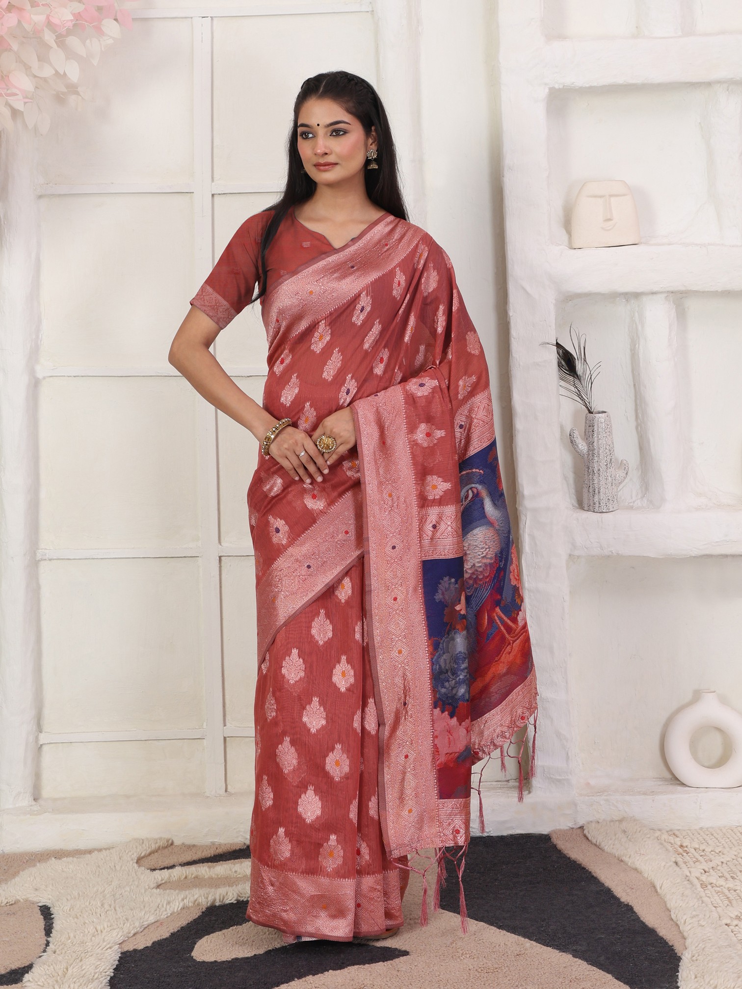 Rust Color Linen Cotton Fabric Ceremonial Looks Partywear Saree