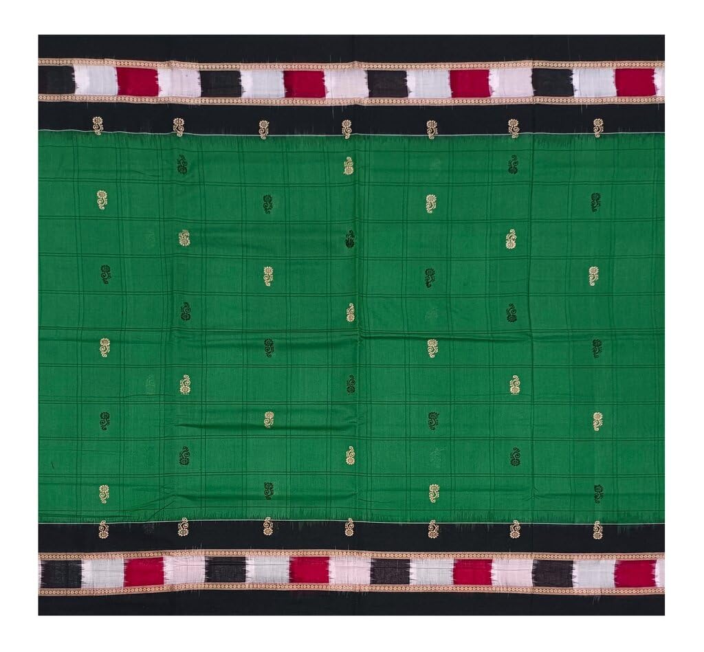 HomeFashionSareeSAMBALPURI BANDHA CRAFT Sambalpuri bomkai cotton saree with blouse piece(Flower motifs in green color base with check check design boarder)