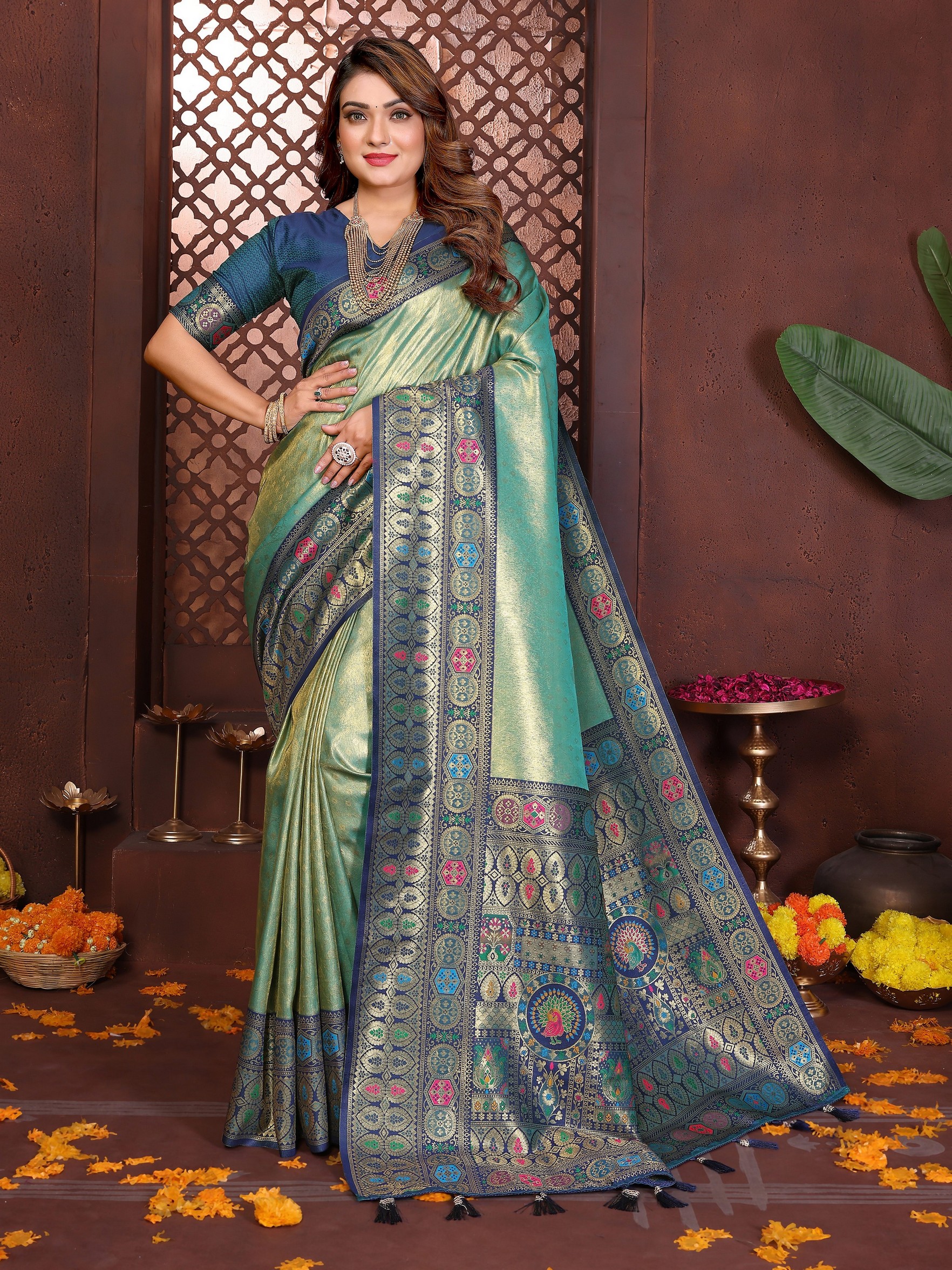 Sea Green Color Banarasi Tissue Silk Fabric Woven Rich Paithani Designer Saree