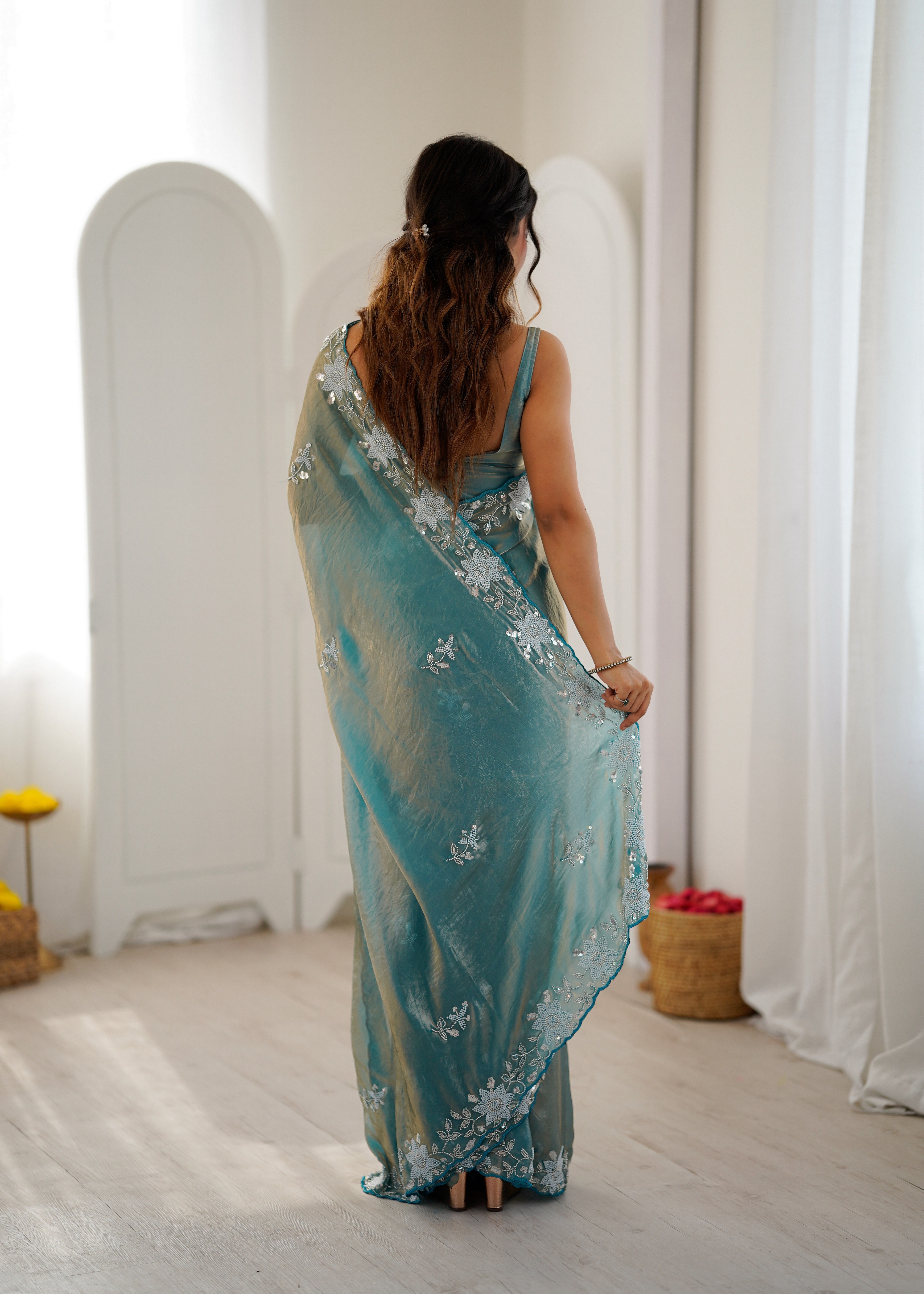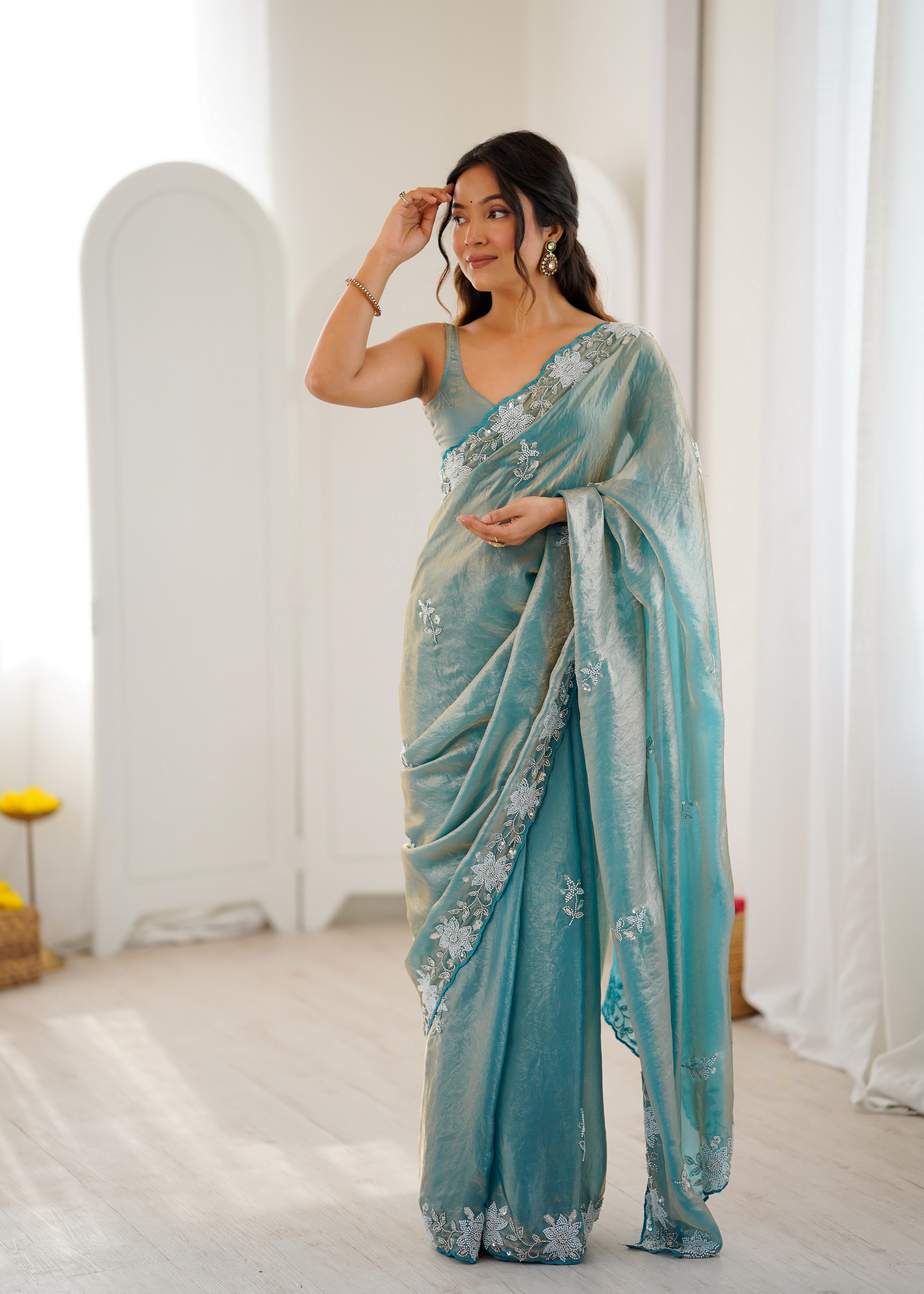Sea Green Color Fendy Satin Graceful Embroidered Bollywood Saree