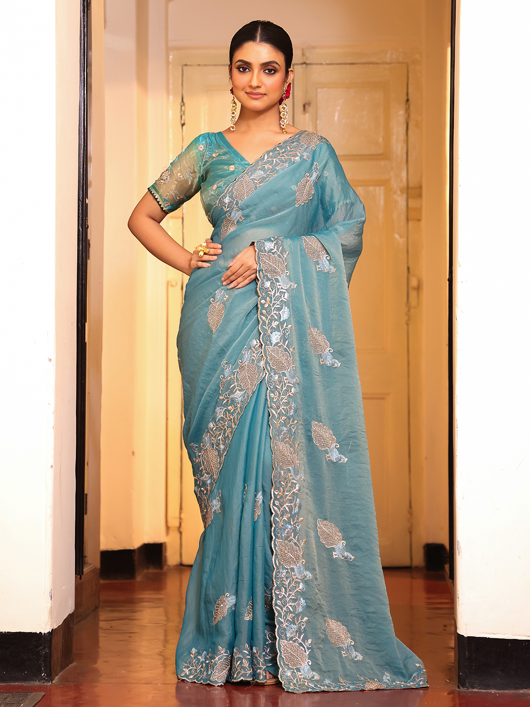Sky Blue Color Tissue Fabric Embroidery Work Partywear Saree
