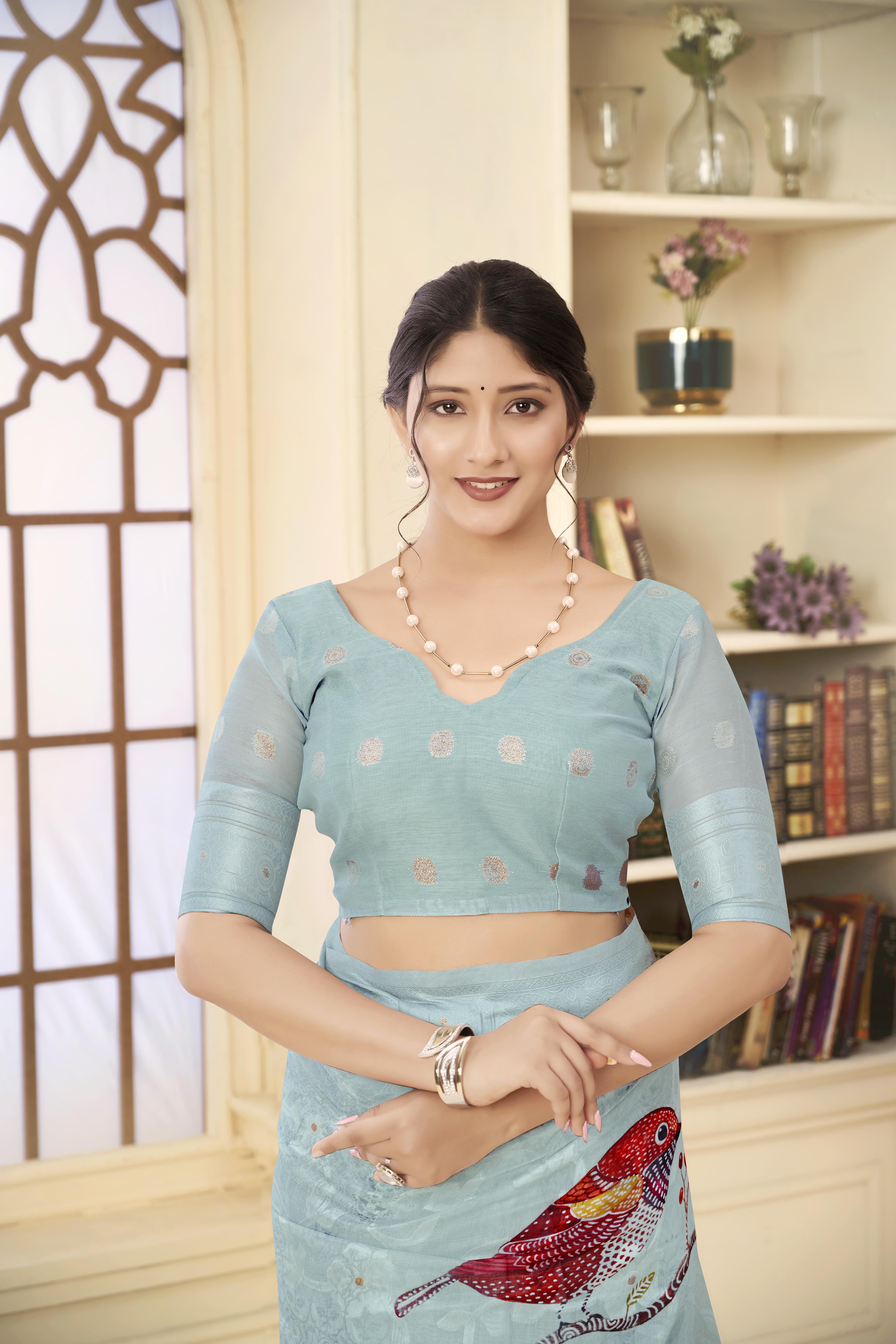 Sky Blue Color Wevon Jacquard Designer With Printed Rich Silk Fabric Stylish Ceremonial Saree