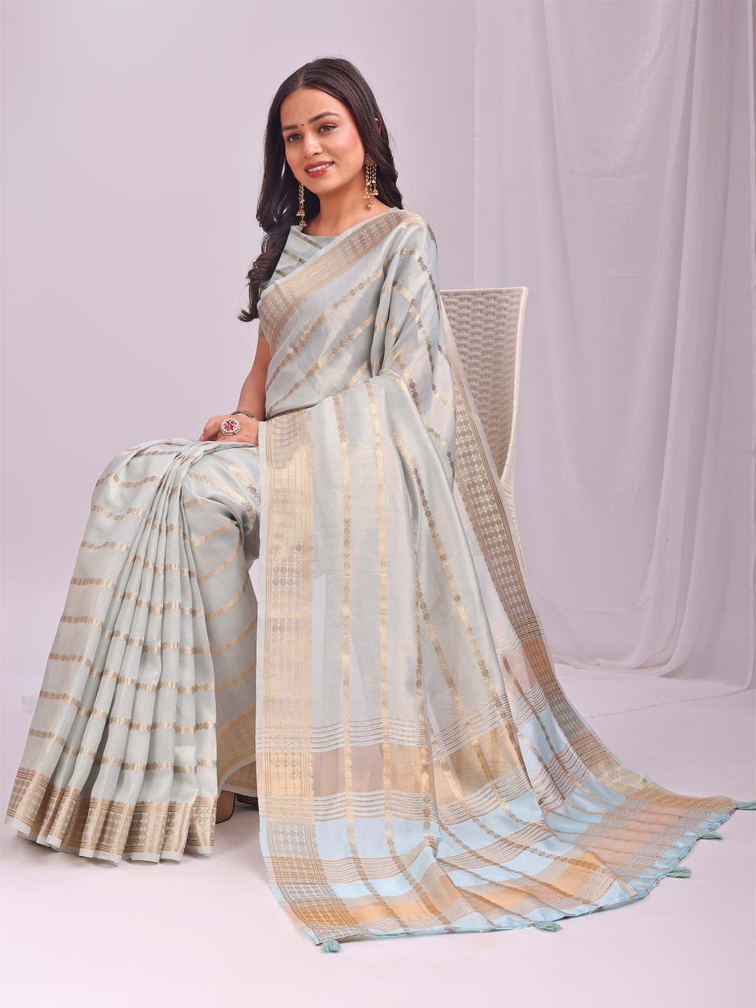 Sky Blue Color Woven Zari Designer Ethnic Organza Fabric Saree