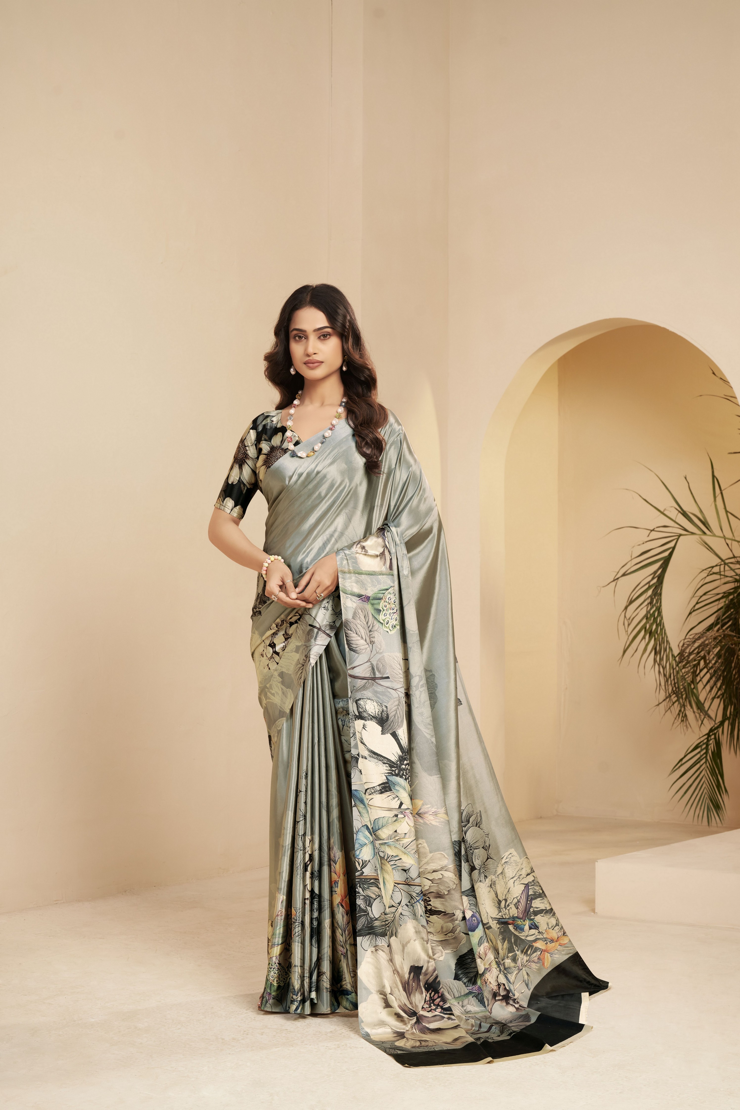Steel Grey Color Malai Crepe Silk Designer Digital Printed Ethnic Partywear Saree