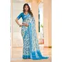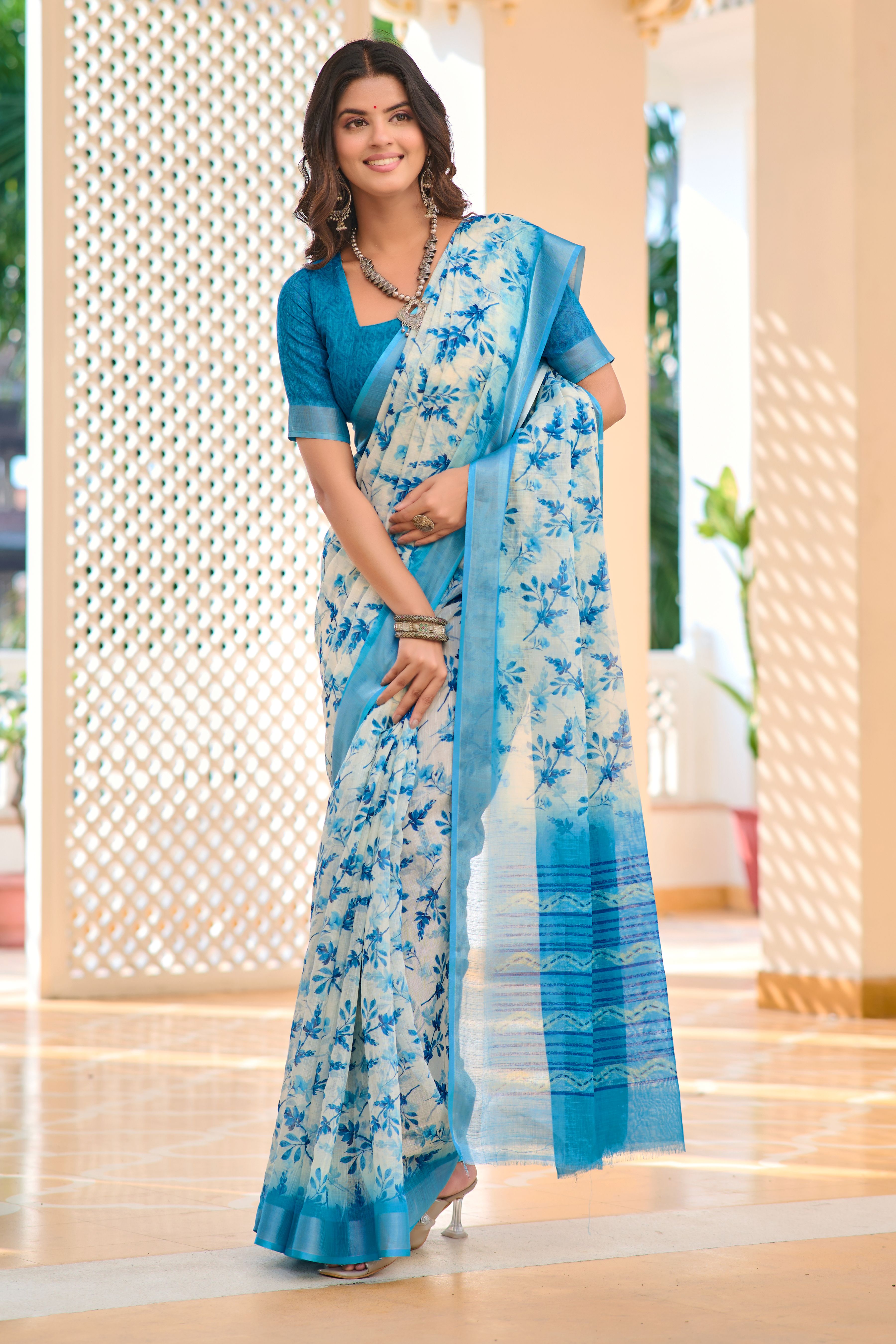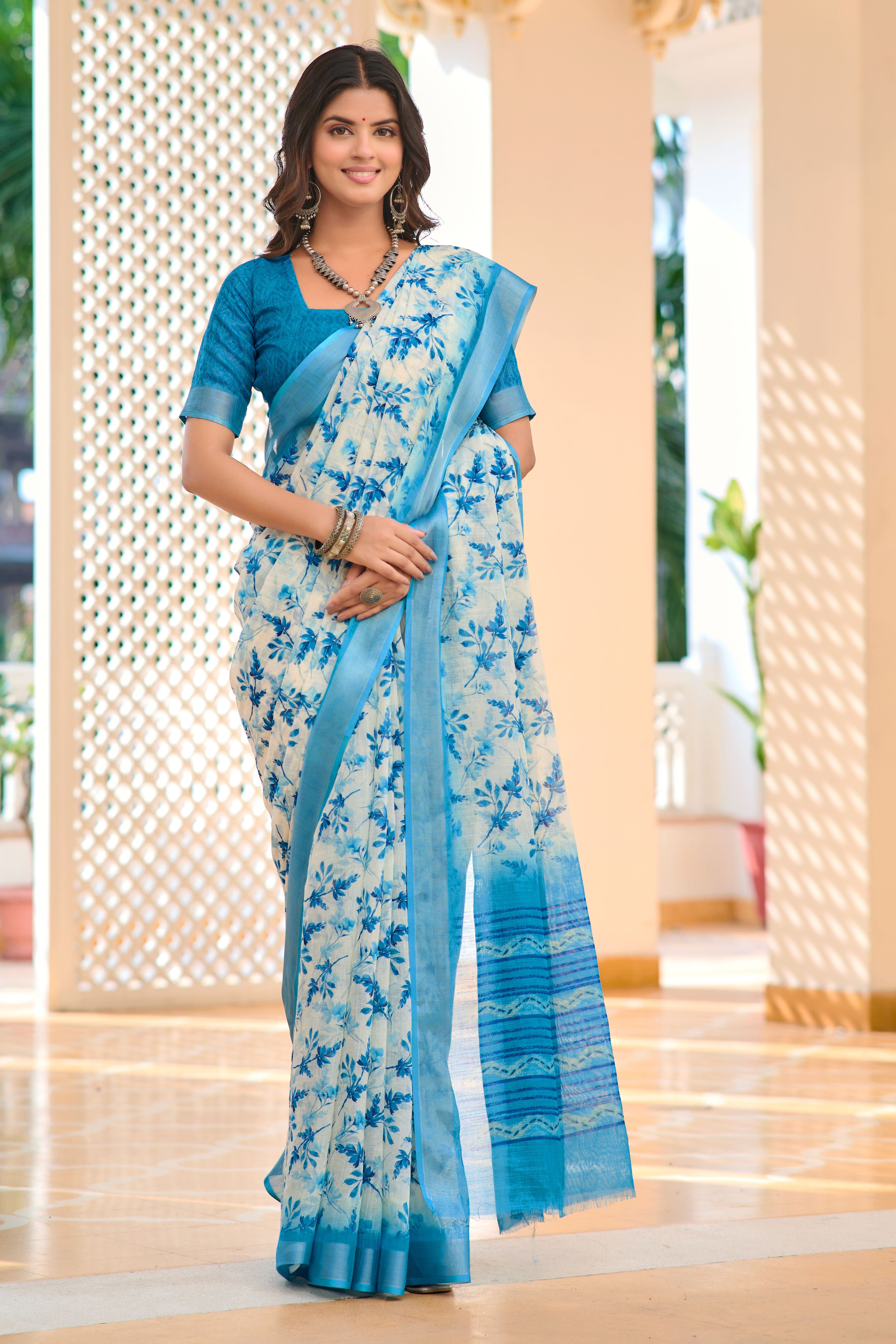 Teal Blue Color Beautiful Linen Cotton Fabric Designer Festive Wear Saree