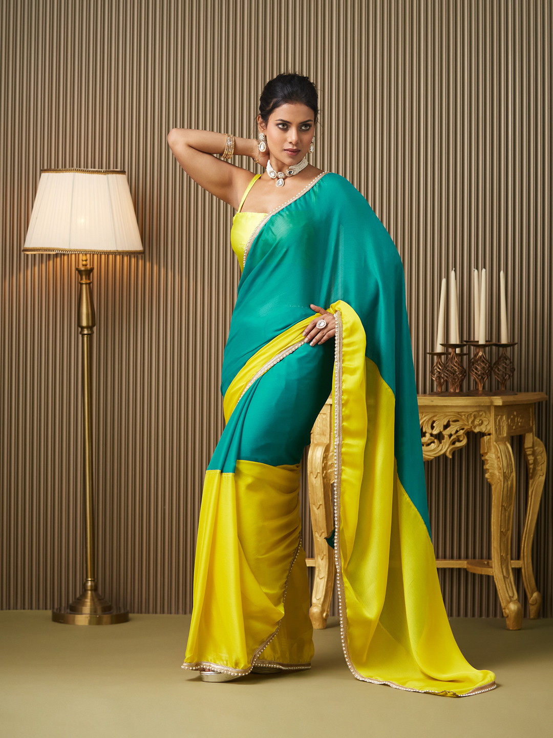 Teal Color Chiffon fabric Motiwork Lace Colorblocked Ceremonial Saree