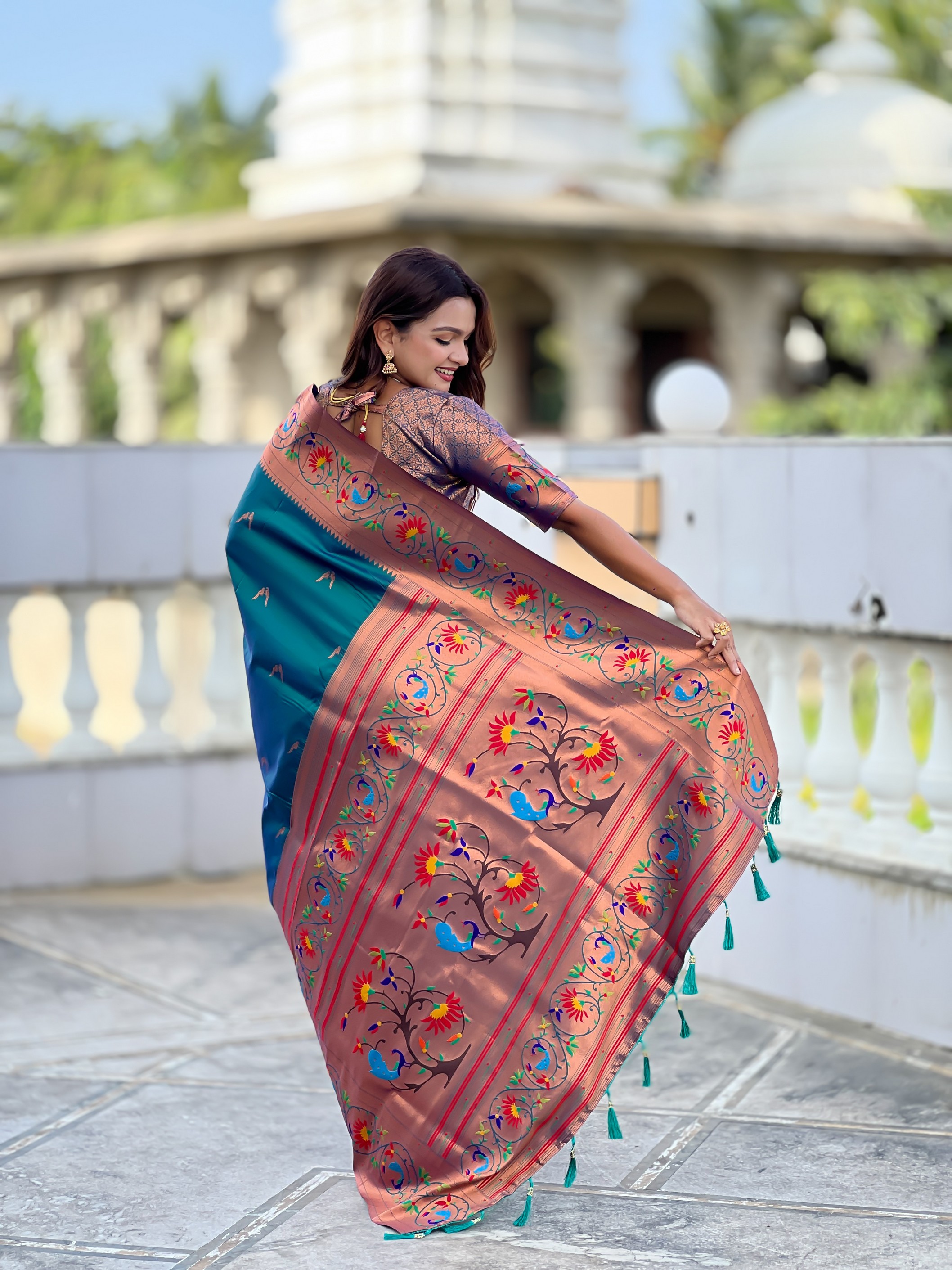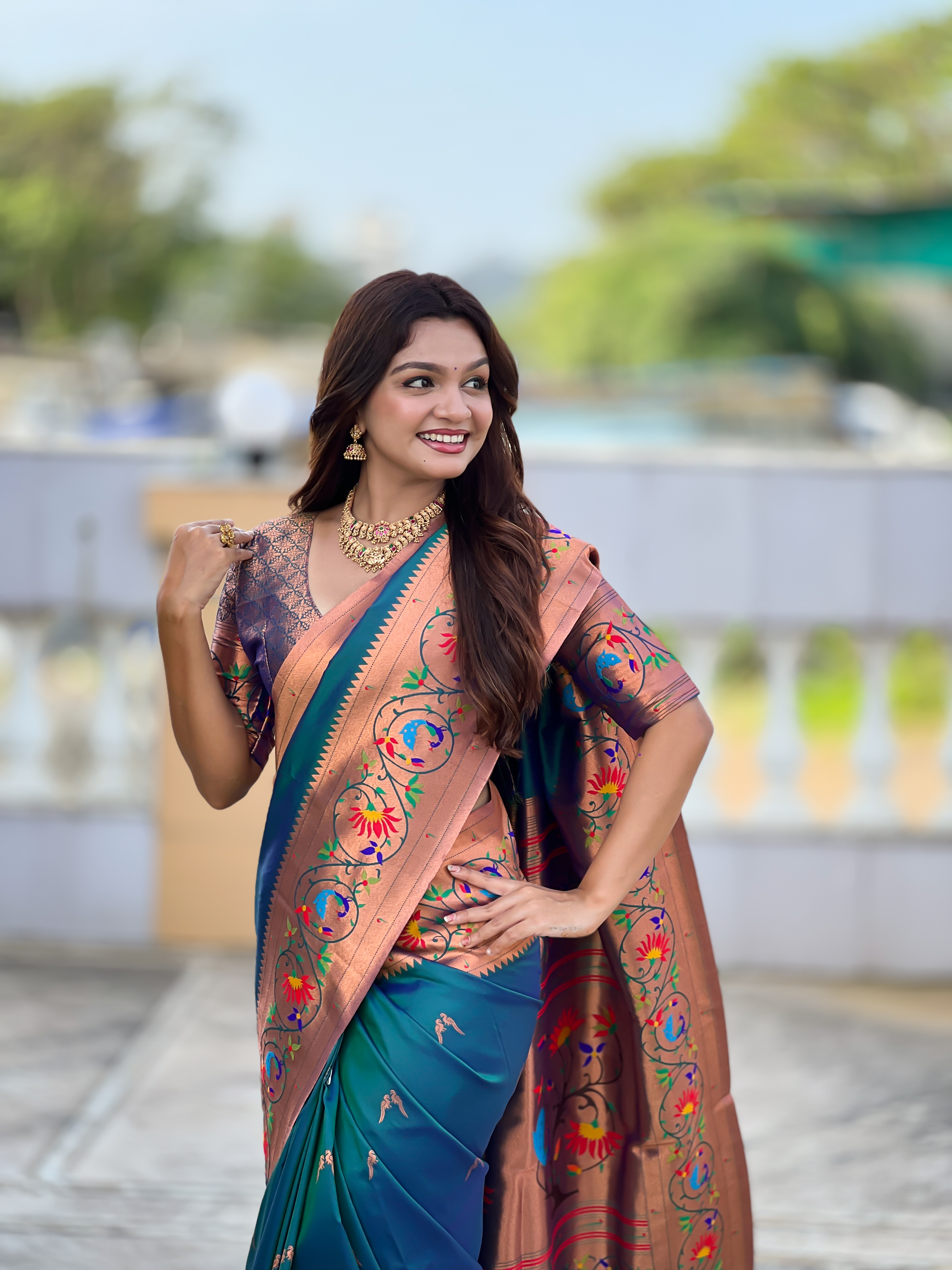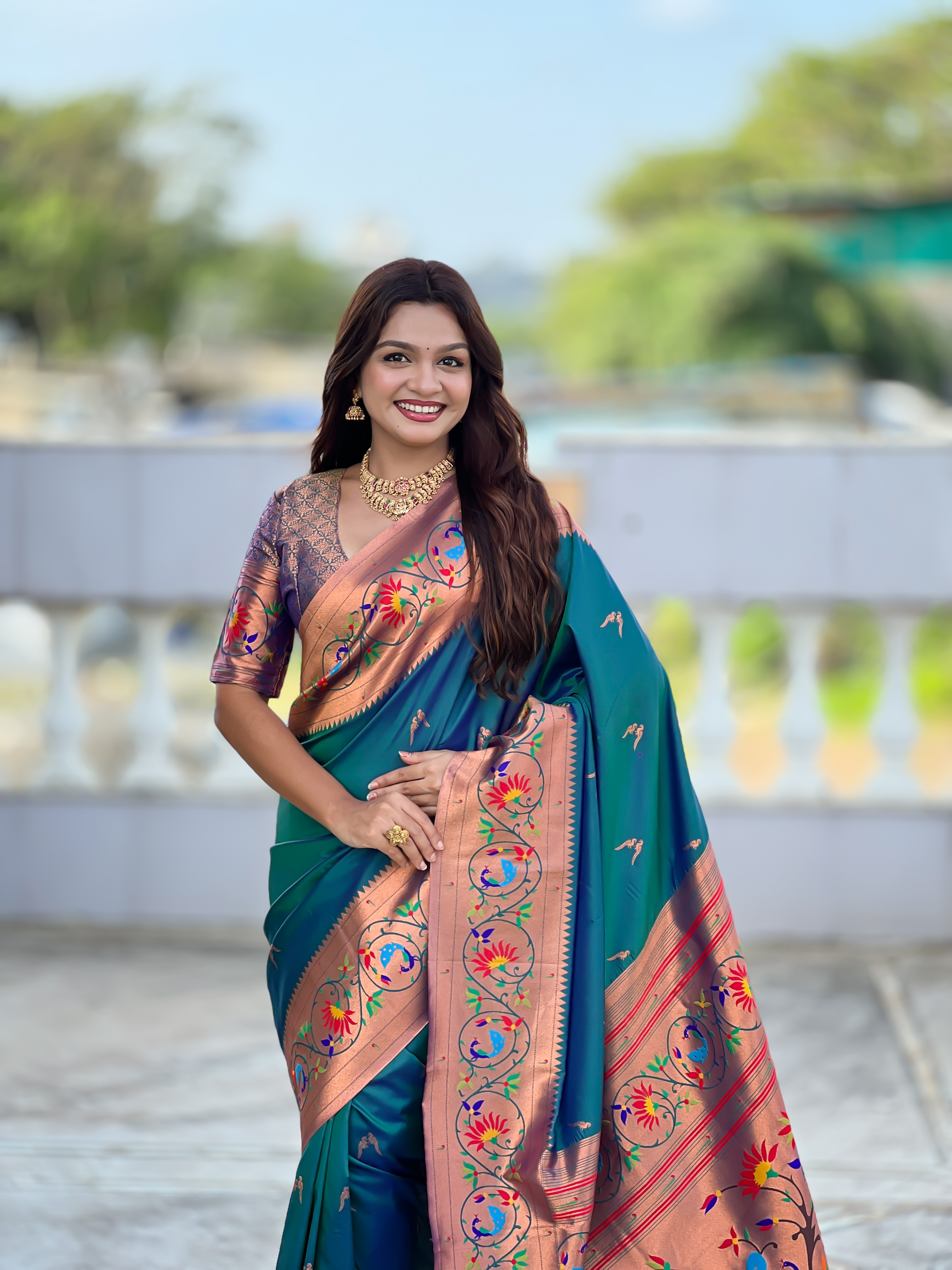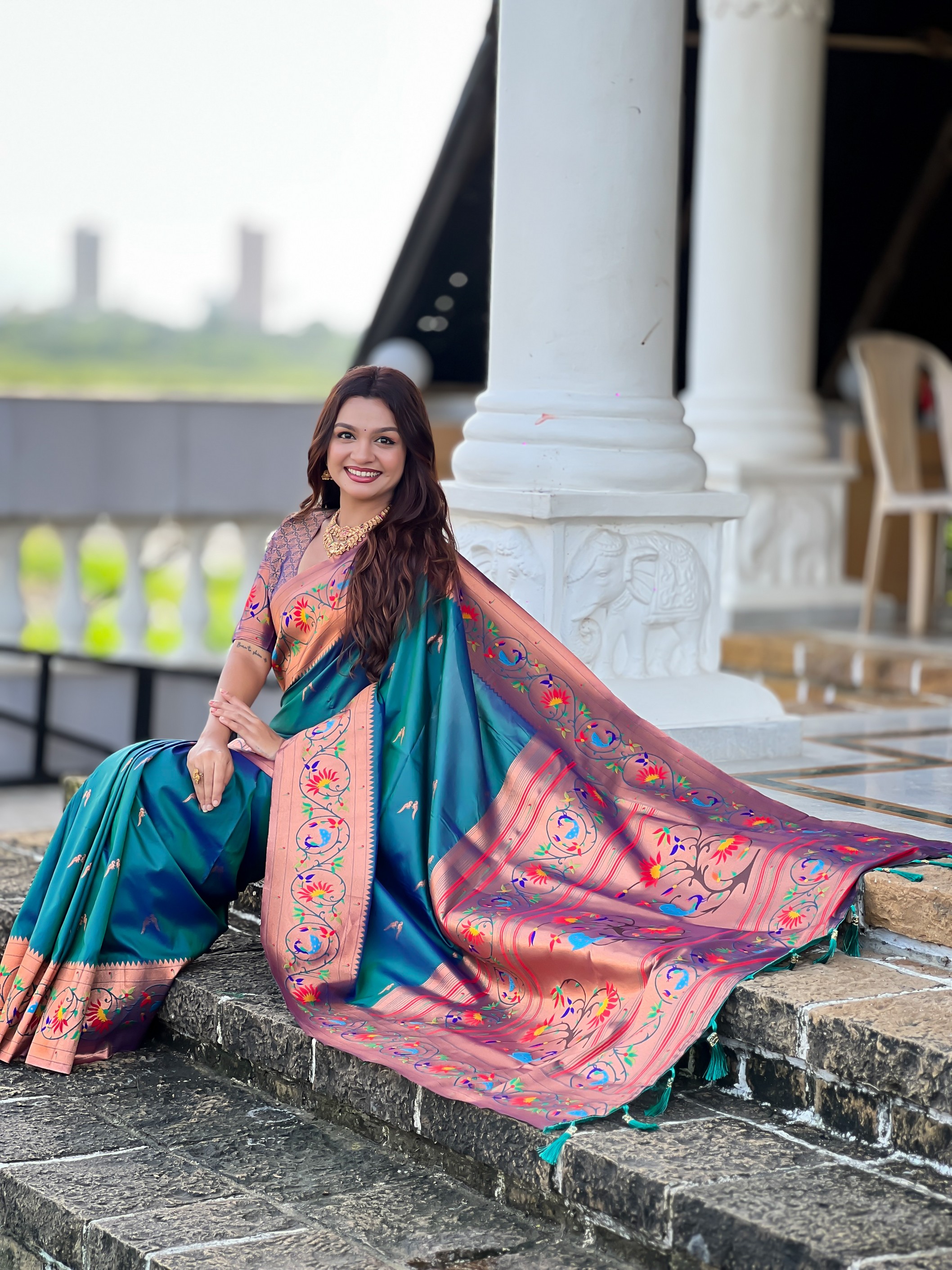 Teal Color Paithani Silk Fabric Woven Meenakari Jacquard Designer Graceful Wedding Saree