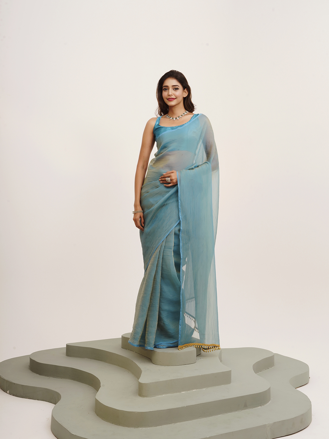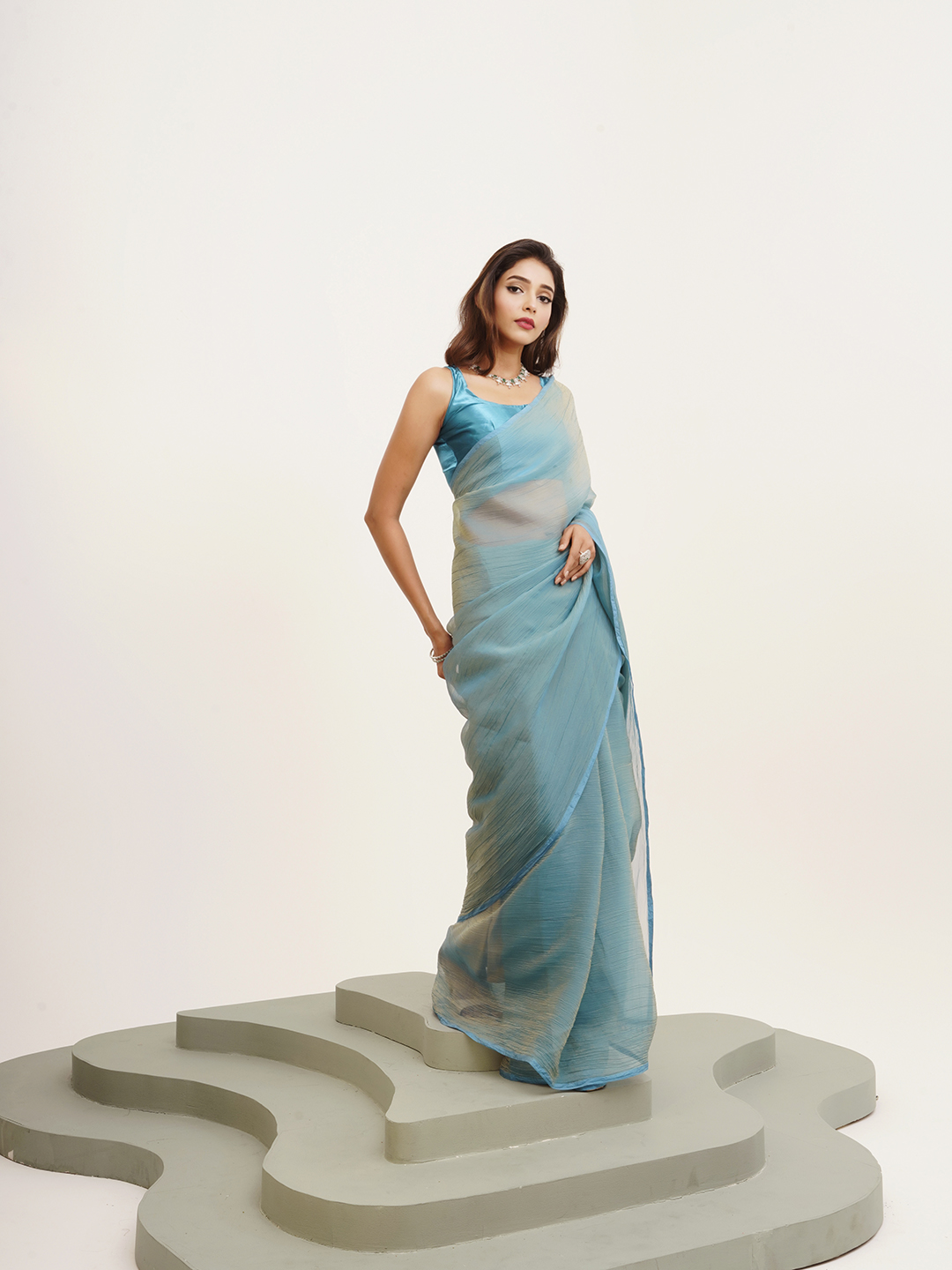 Turquoise Blue Color Beautiful Partywear Solid Satin Saree