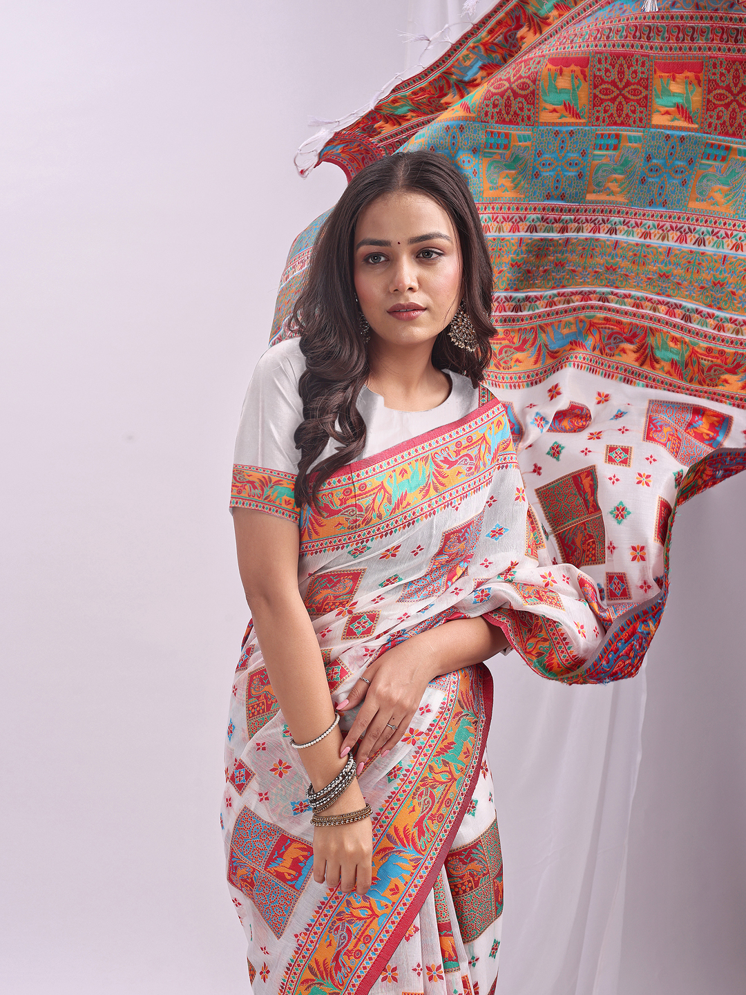 Wevon Thread Designer White Color Linen Cotton Fabric Traditional Rich Looks Saree