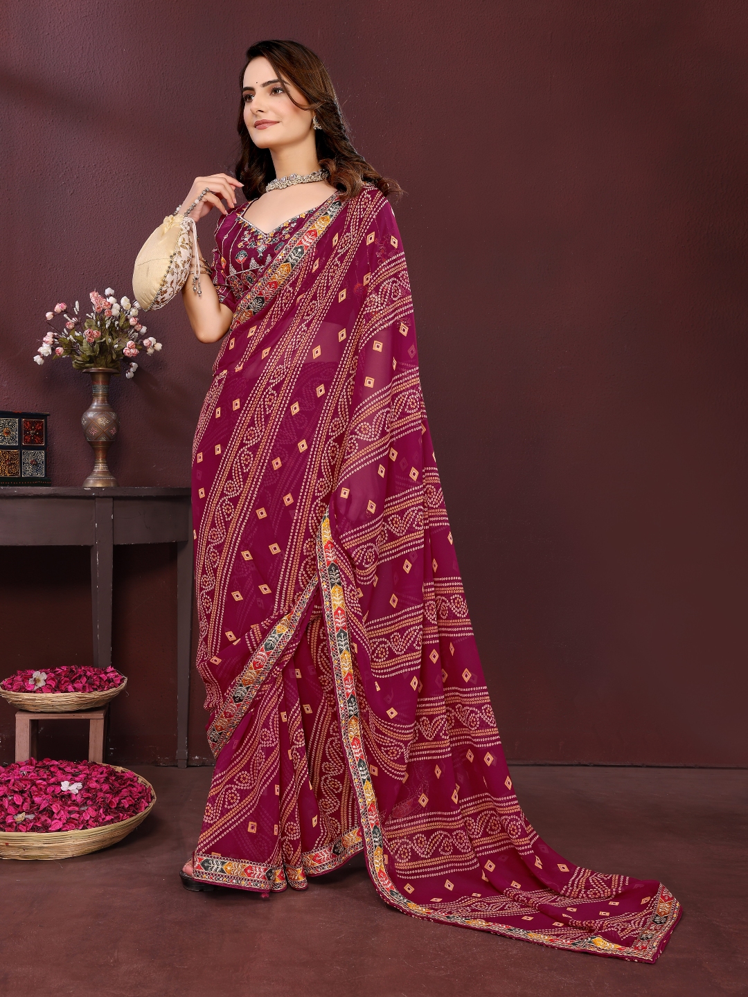 Wine Color Georgette Fabric Bandhej Printed Traditional Saree