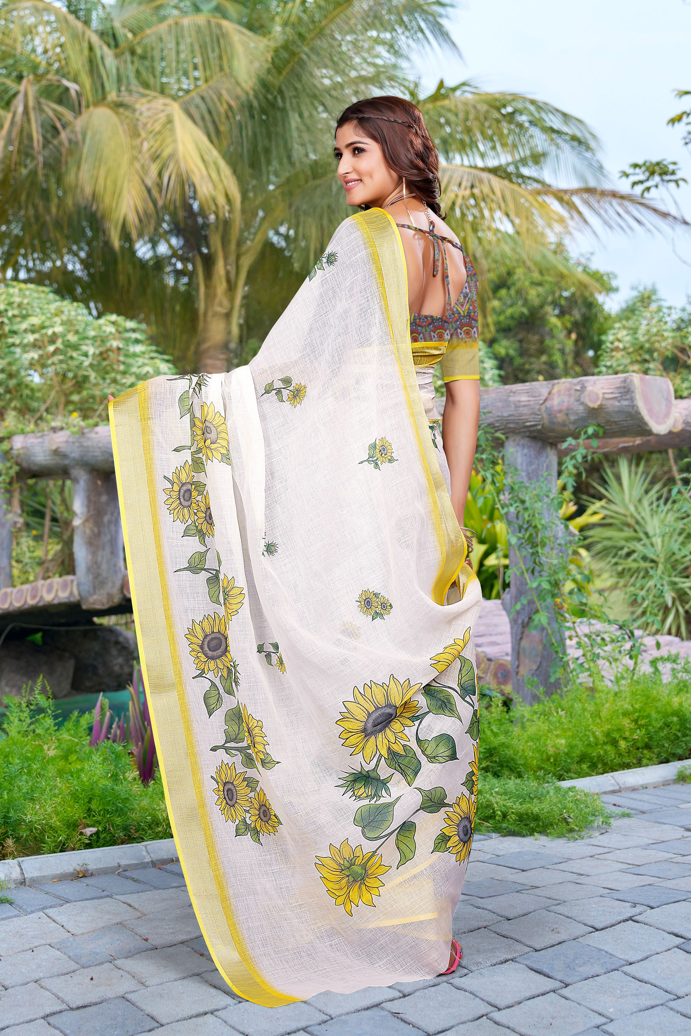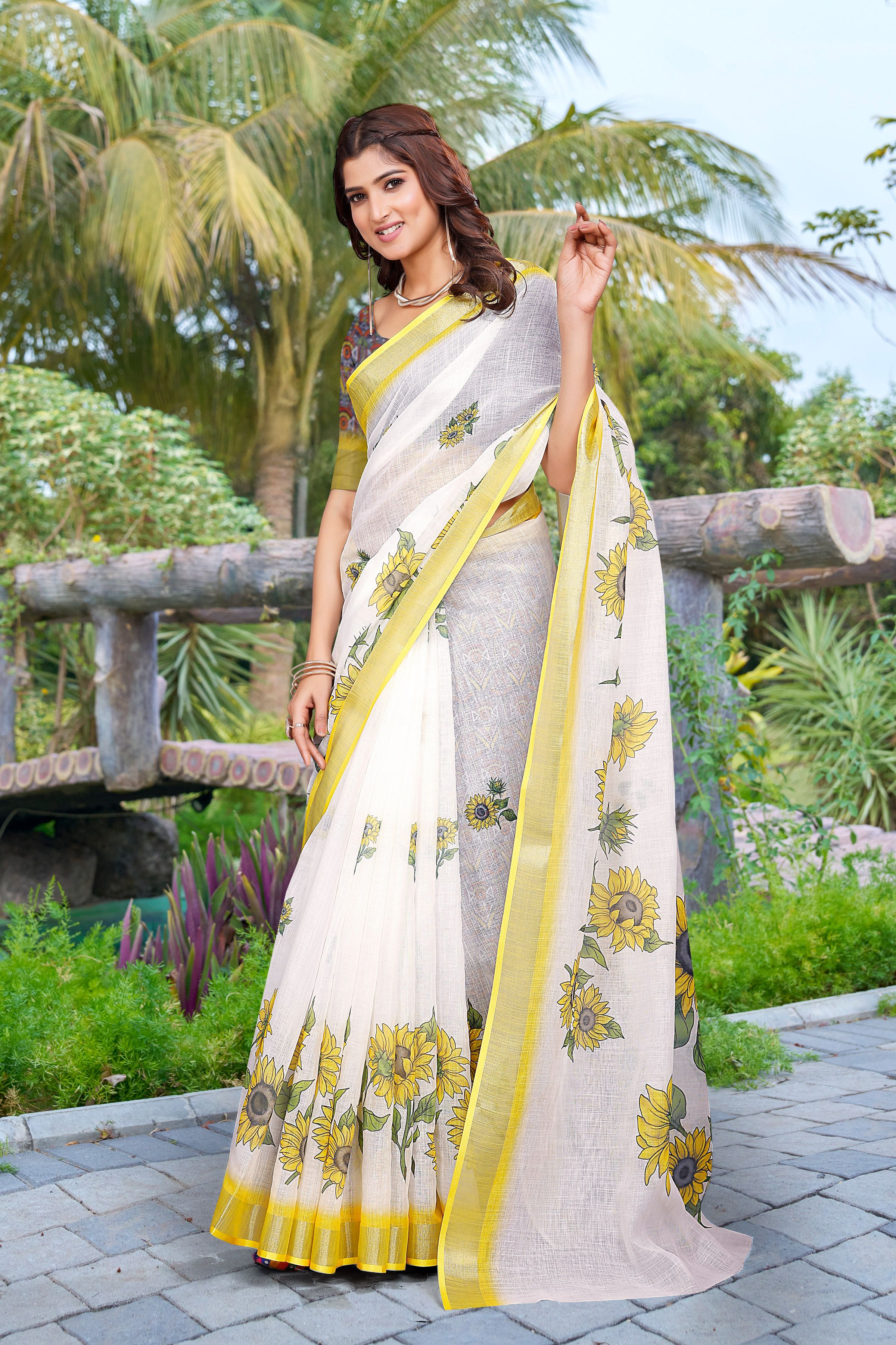 Yellow Color Linen Cotton Fabric Beautiful Festive Special Saree