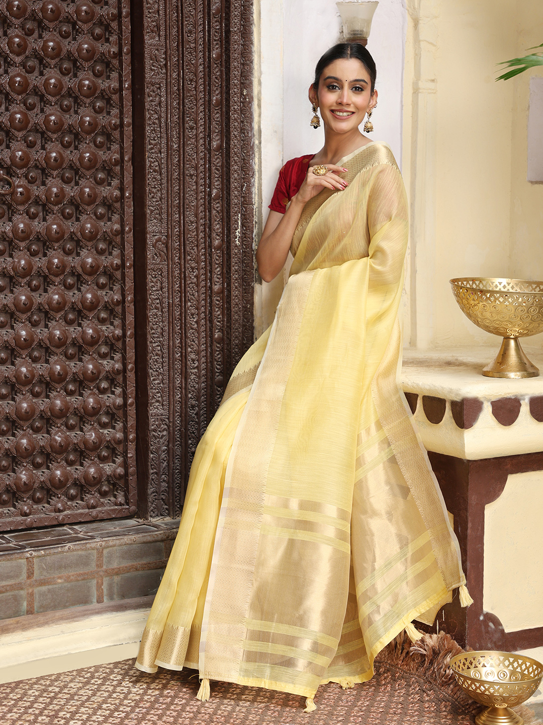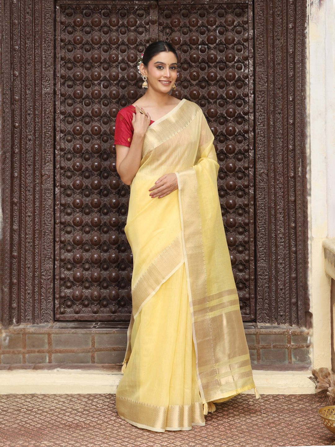 Yellow Color Rich Ceremonial Looks Cotton Based Woven Designer Saree
