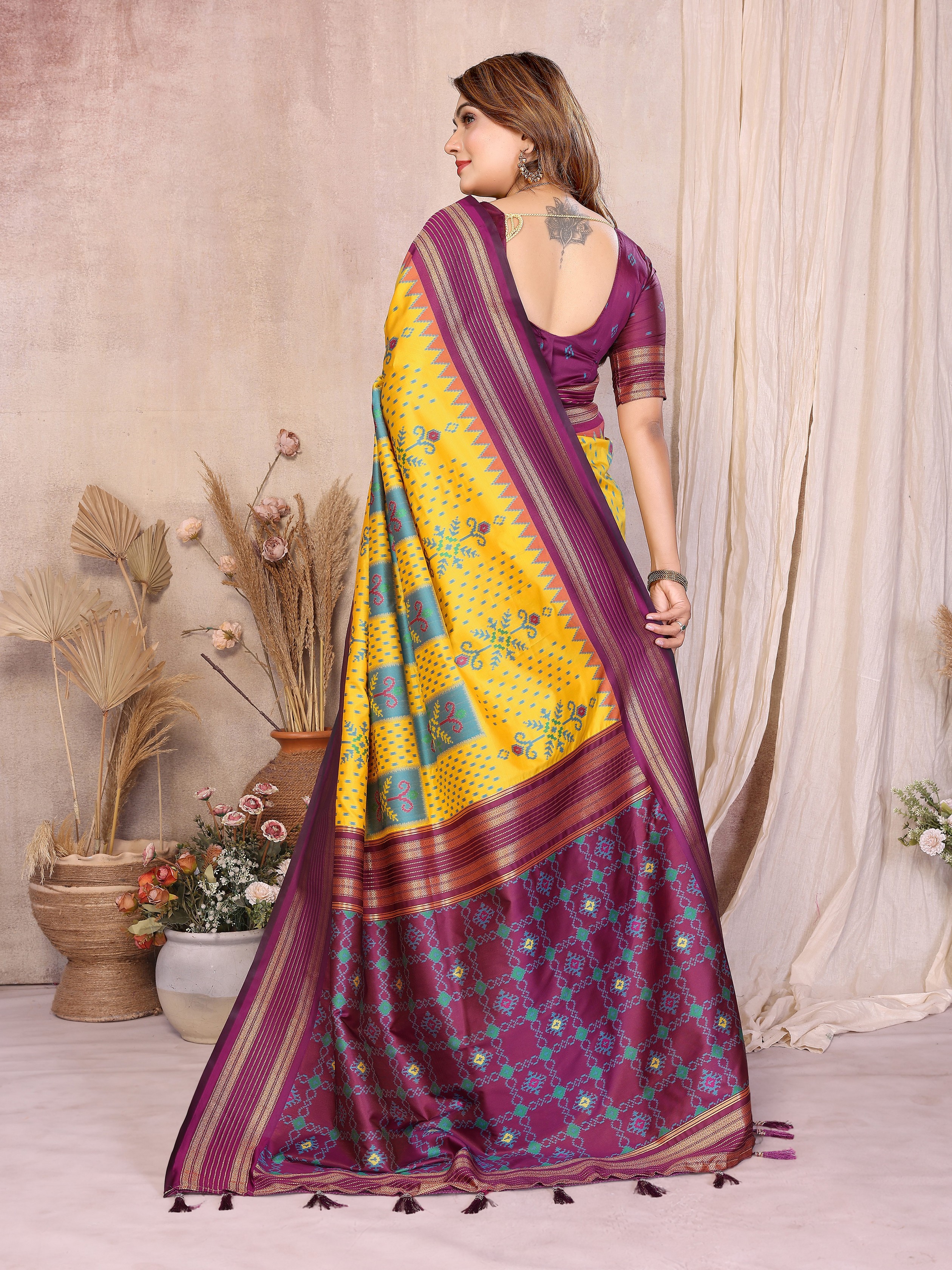 Yellow Color Soft Silk Fabric Ikkat Weaving Designer Traditional Partywear Saree