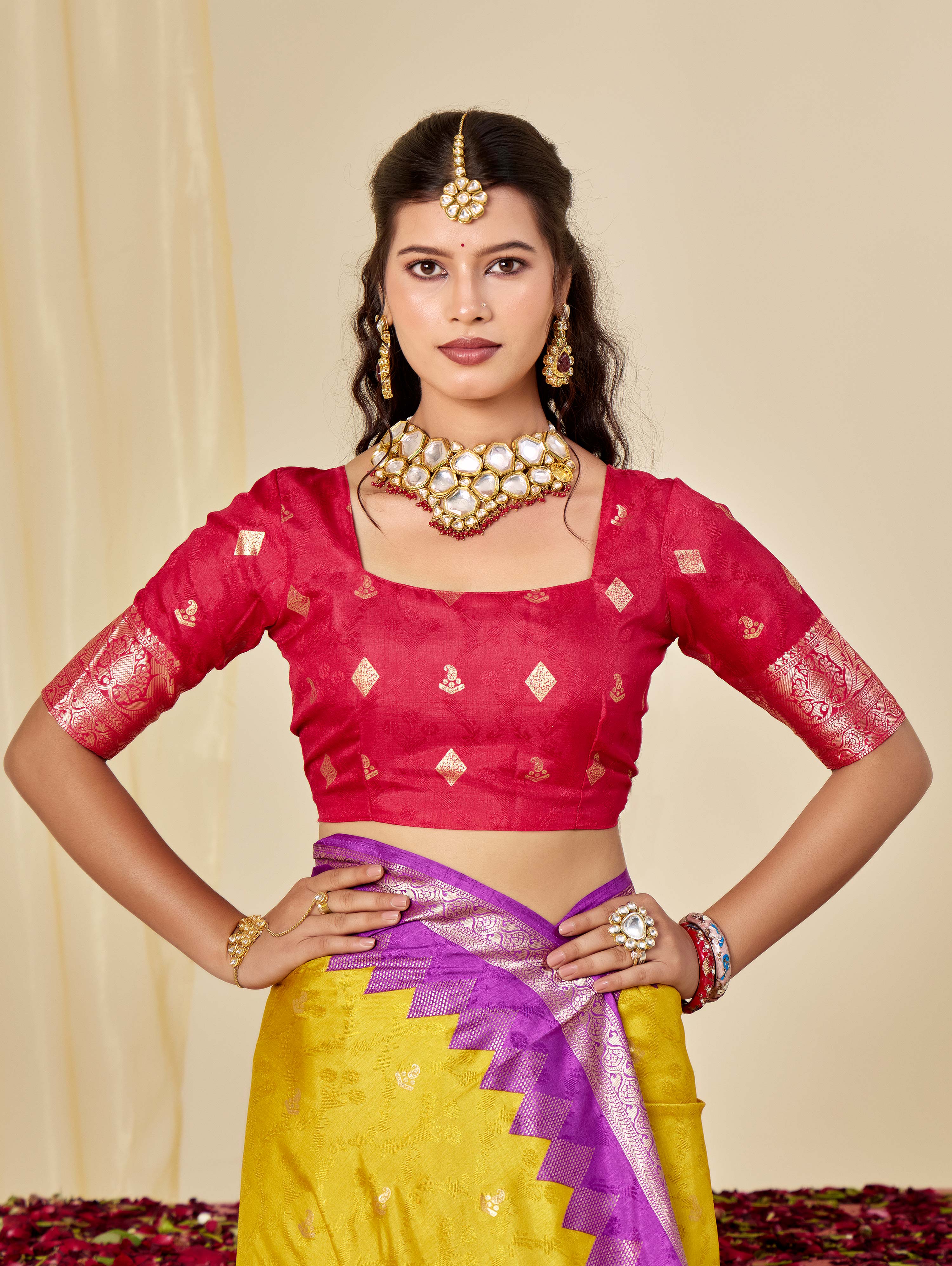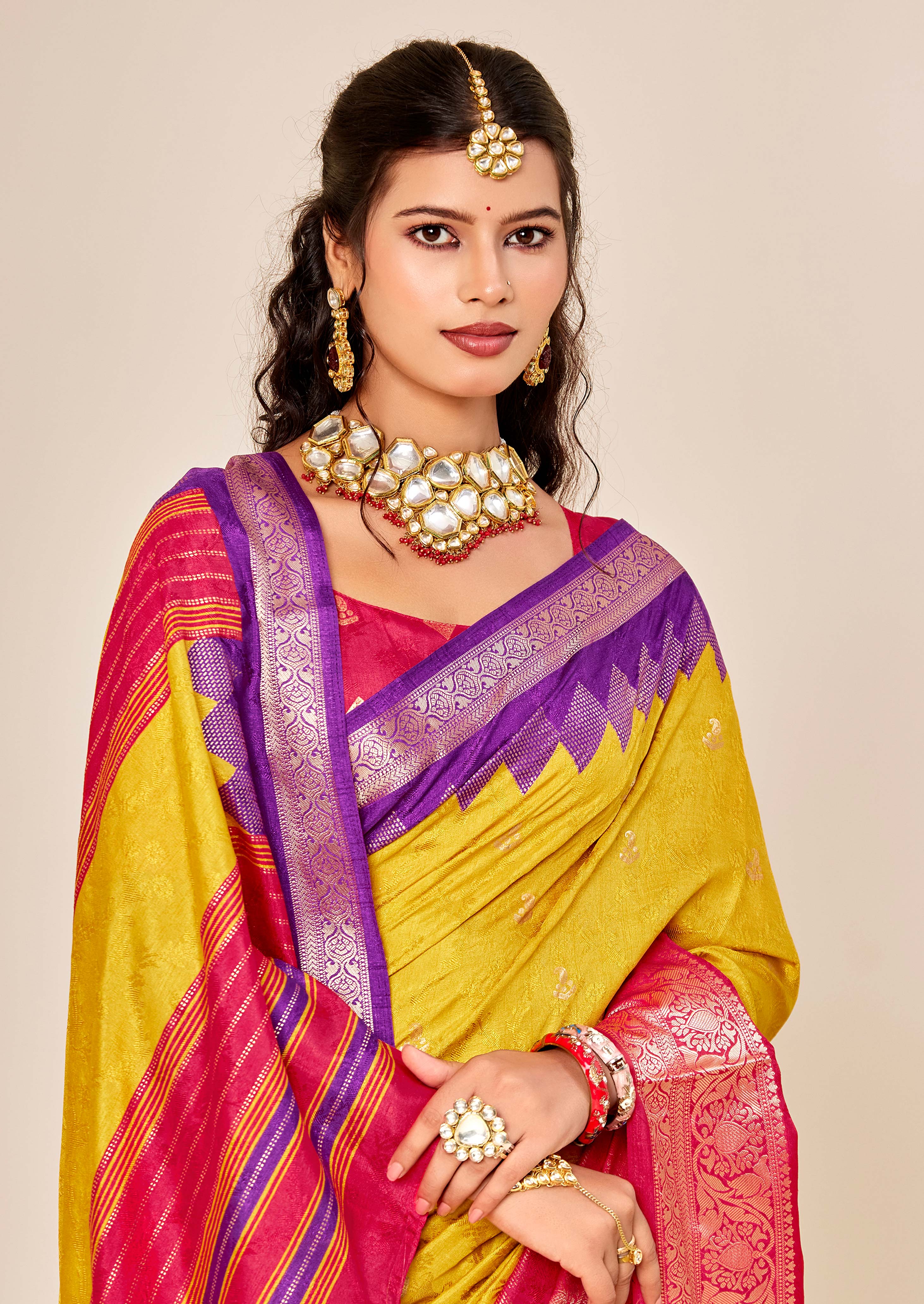 Yellow Color Velvet Tussar Silk Fabric Woven Saree With Smart Elegant Print