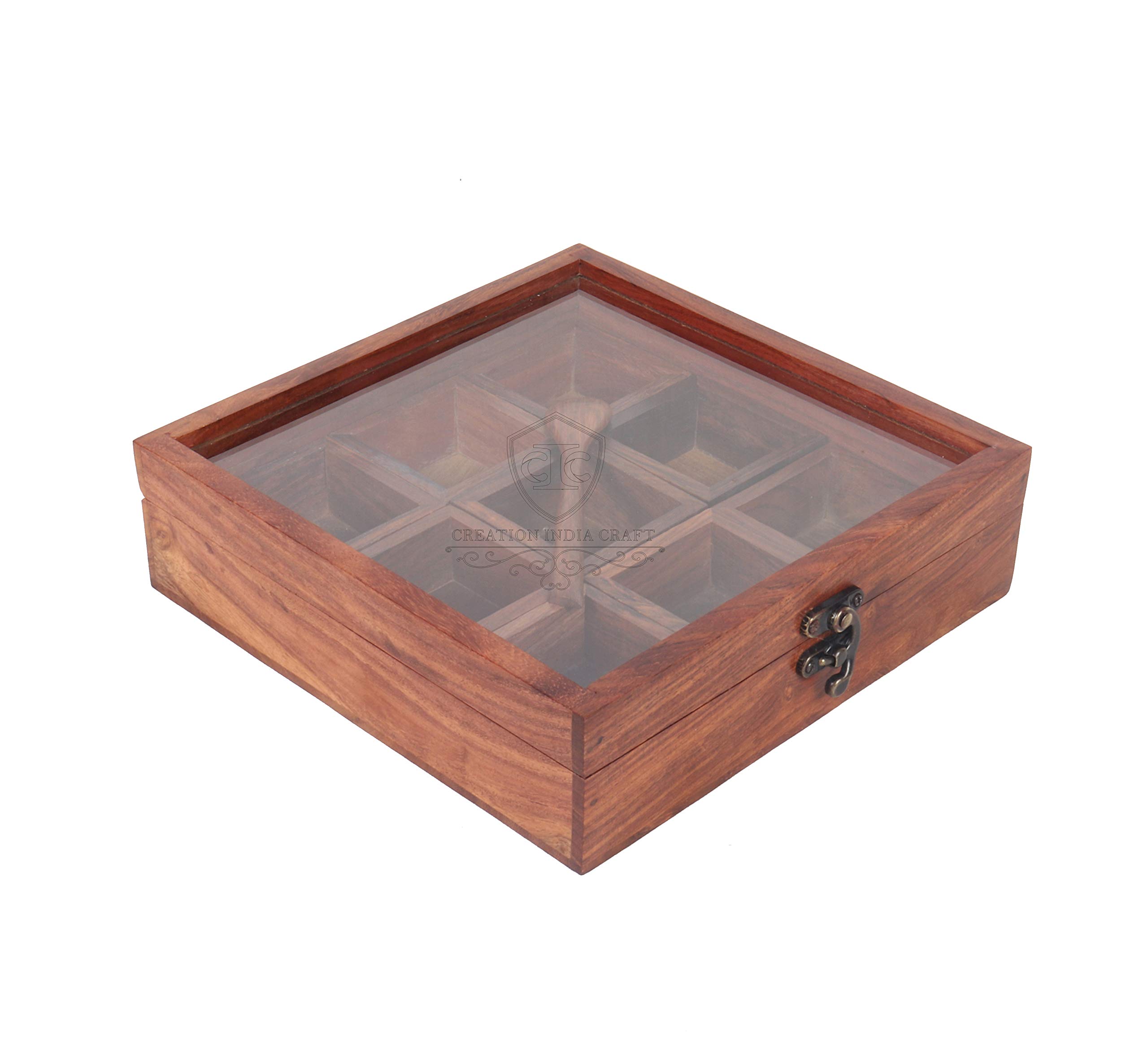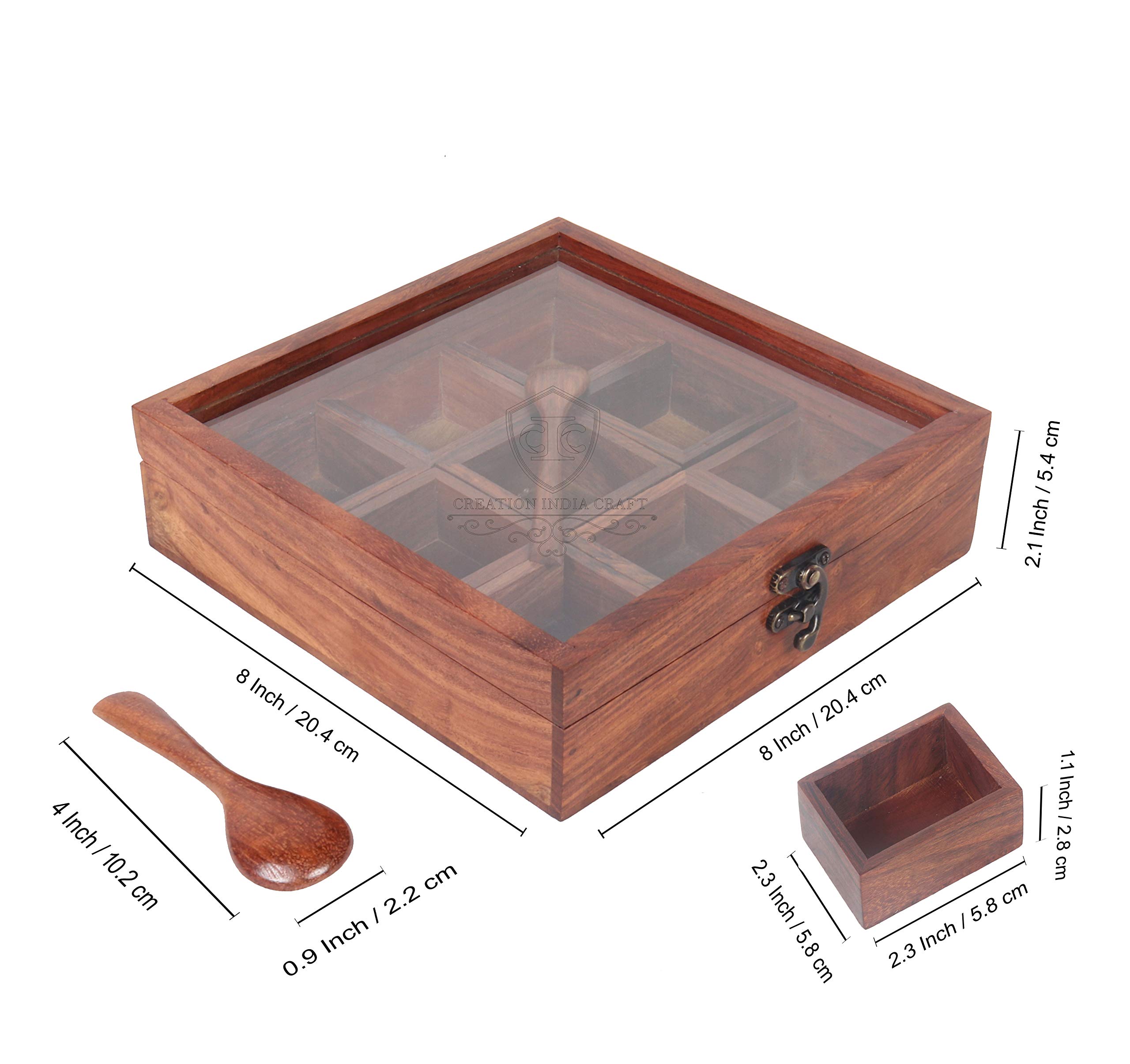 • Attractive Design: Crafted from pure Sheesham Wood this spice box features an attractive design. It's not only a stylish addition to your kitchen but also a safe and eco-friendly choice. It helps keep your spices and dry goods fresher for longer and serve