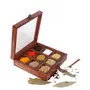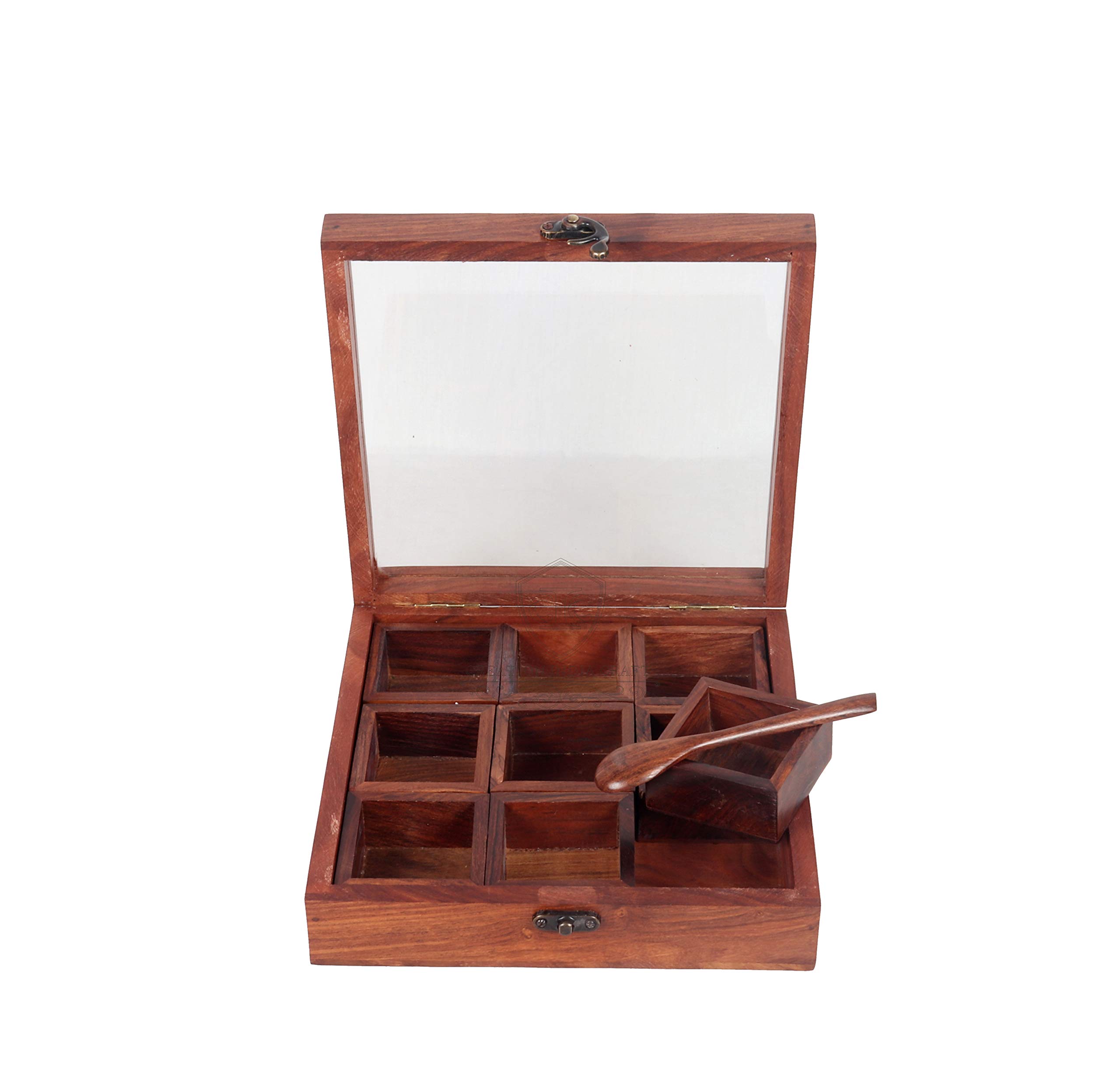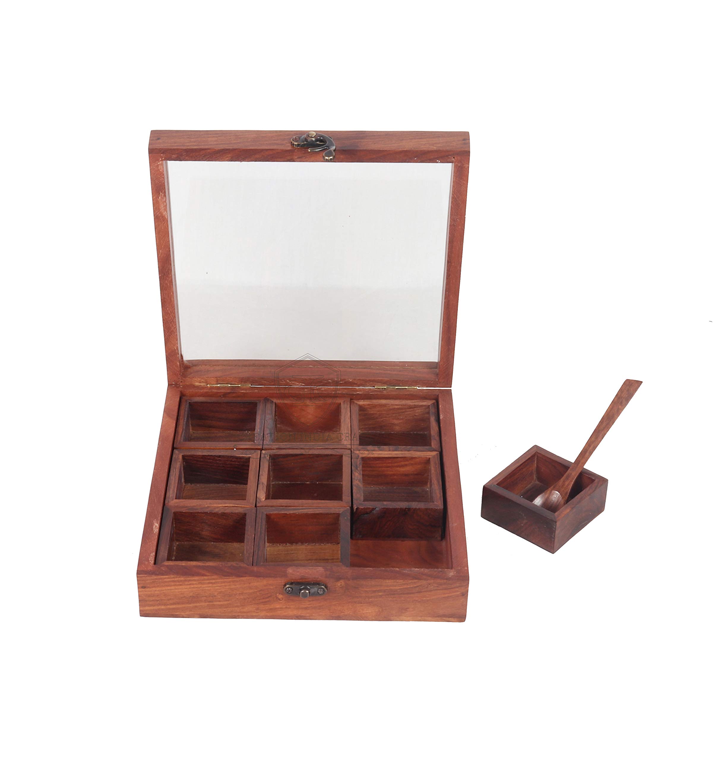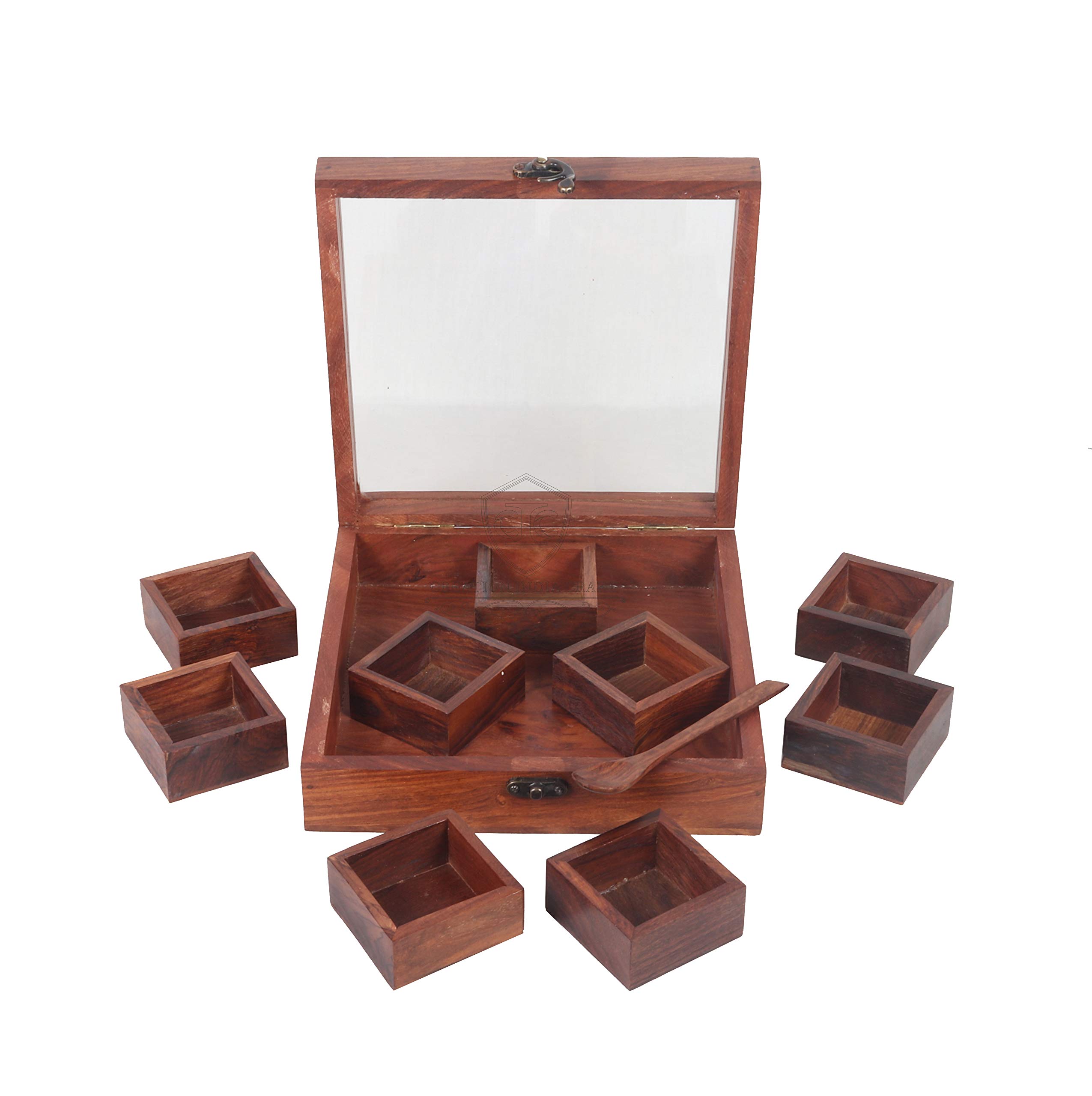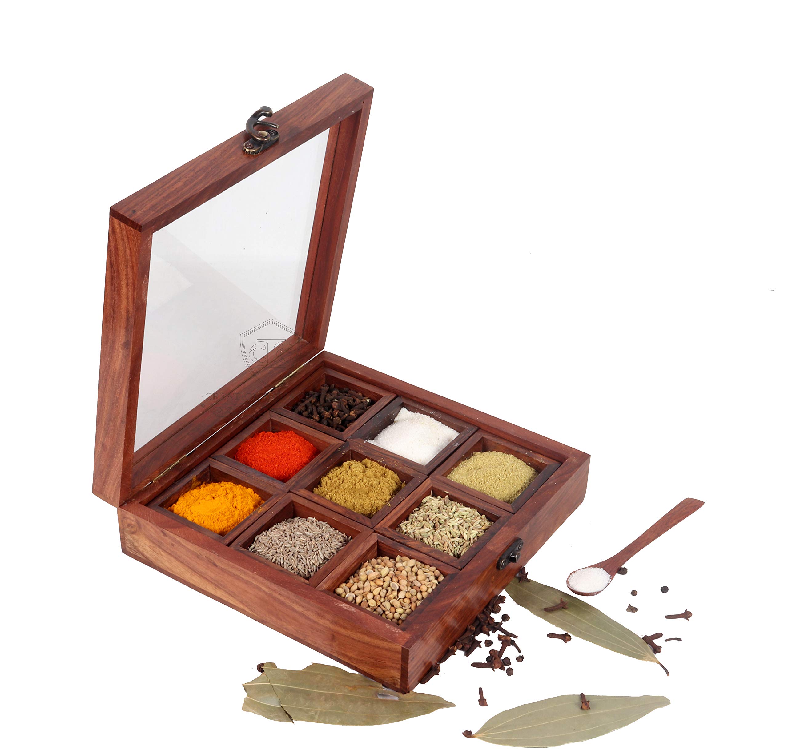 WOOD CRAFTS OF RAJASTHAN Masala Box for Kitchen Wooden Spice box 9 Containers With Spoon Spice Box Container for Kitchen Decor Masala Dabba NamakDani Multipurpose Decorative Box (Pack Of 1)