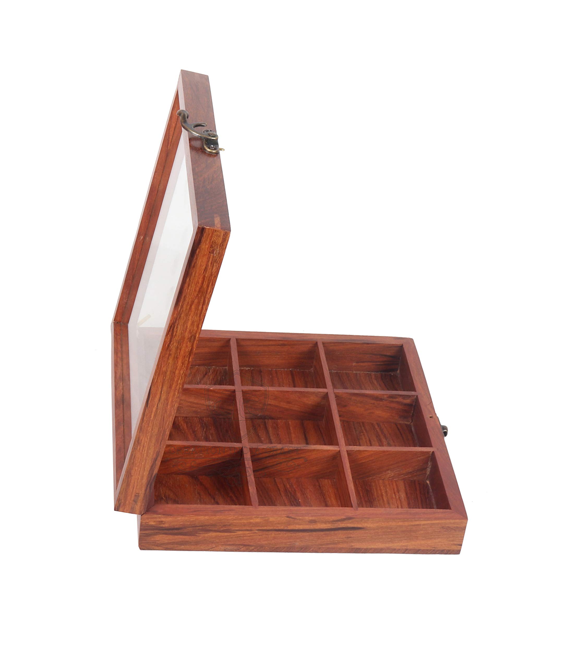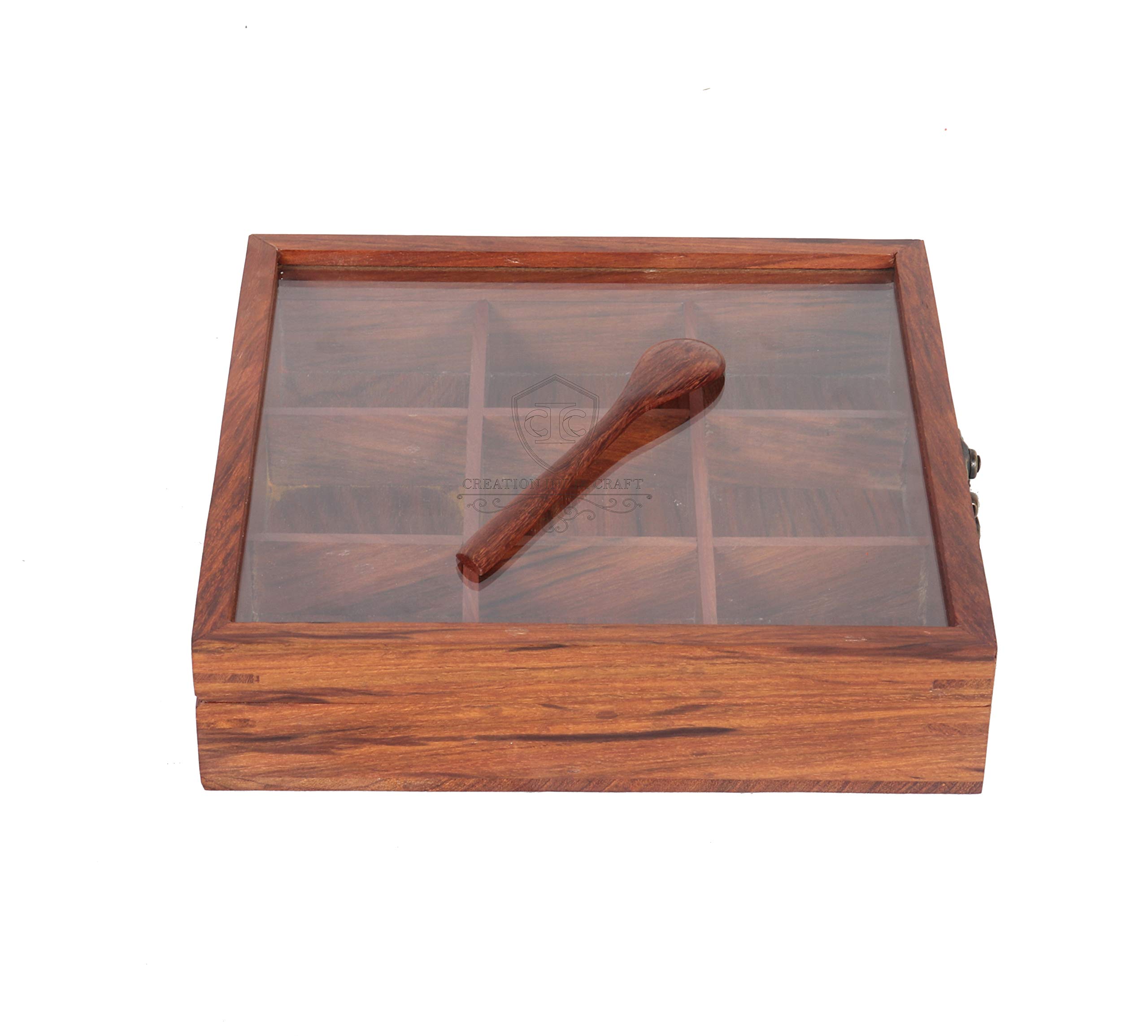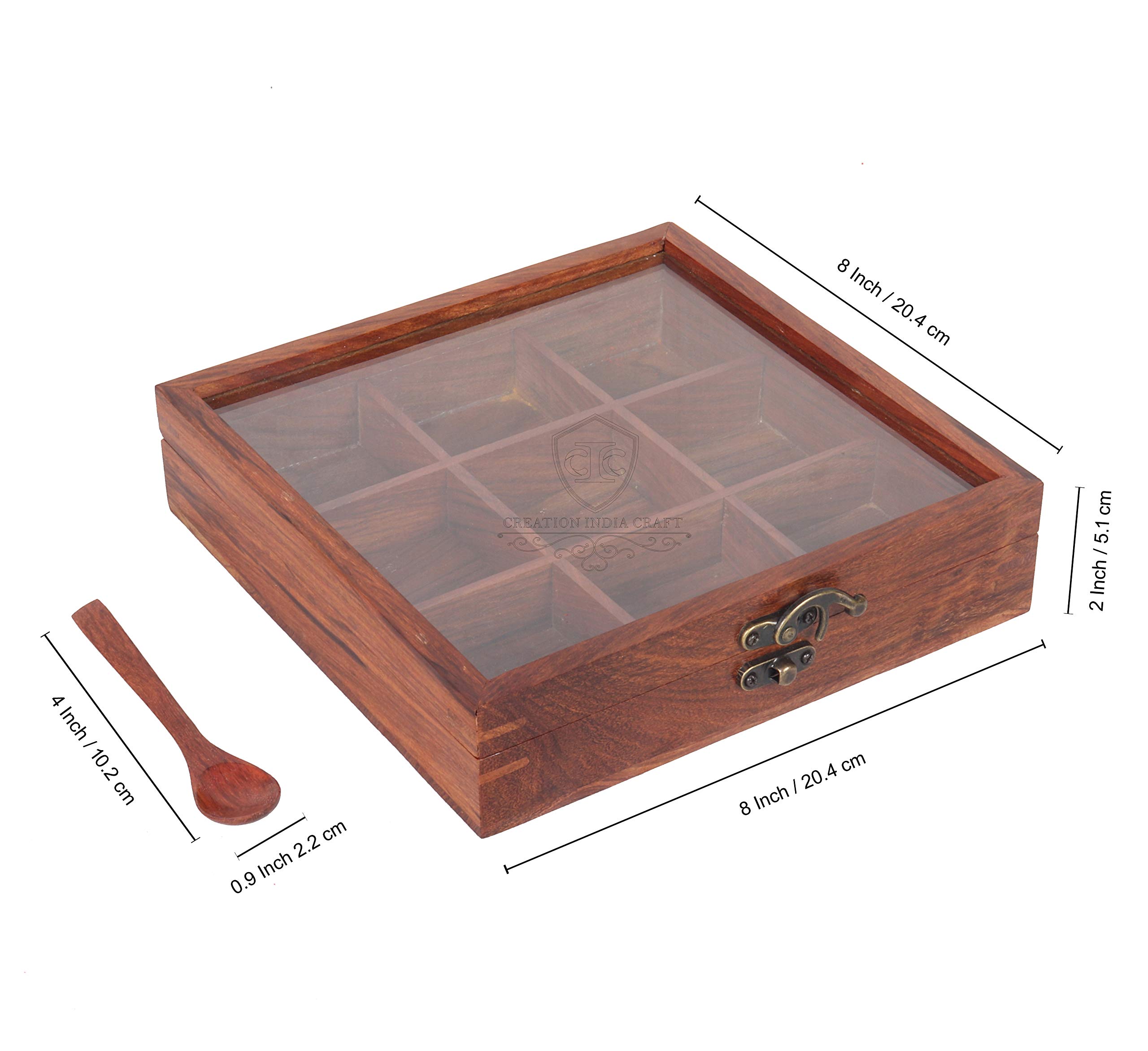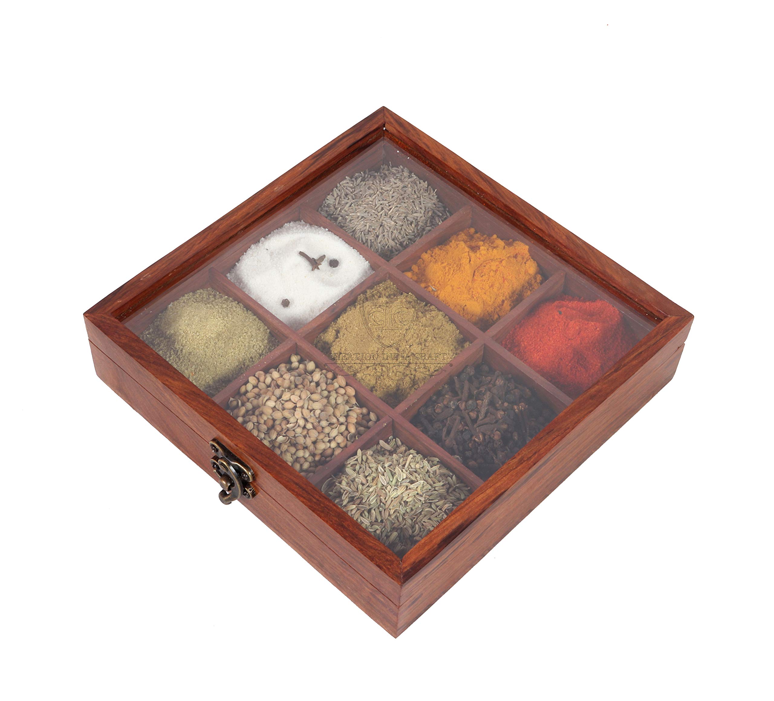HomeFor DeletionWOOD CRAFTS OF RAJASTHAN Masala Box for Kitchen Wooden Spice box 9 Partition With Spoon Spice Box Container for Kitchen Decor Masala Dabba NamakDani Multipurpose Decorative Box (Pack Of 1)