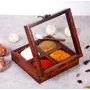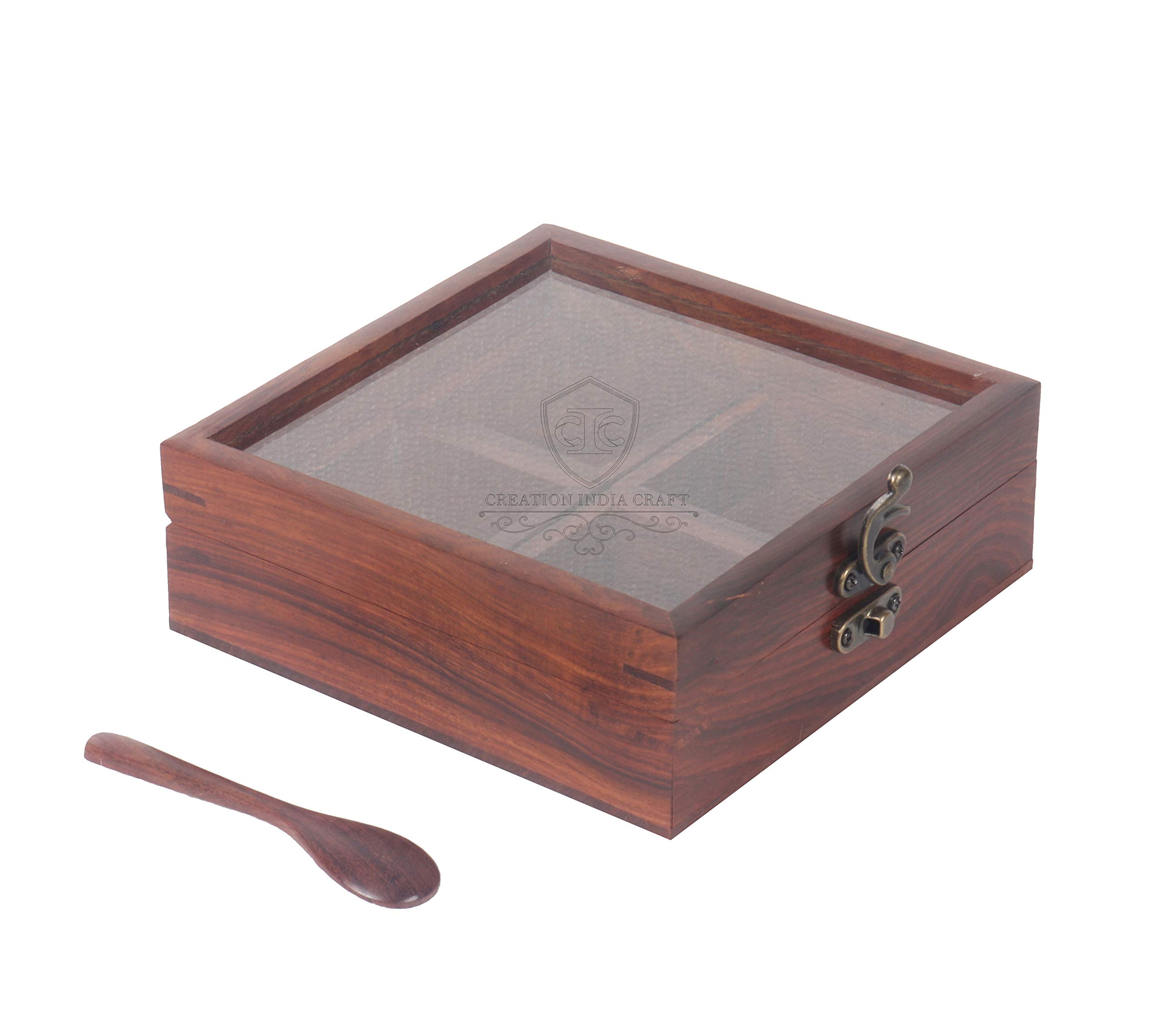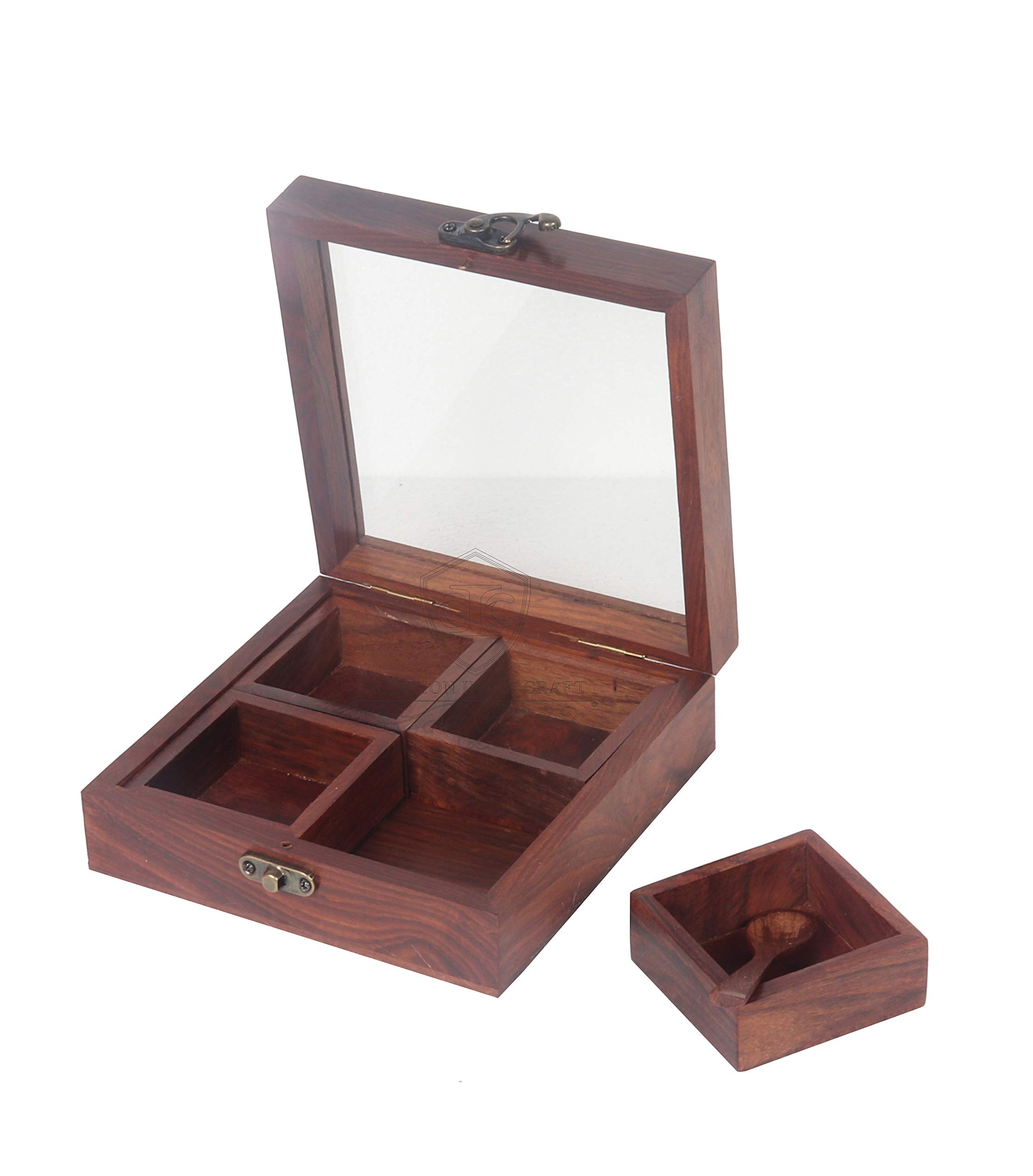 HomeFor DeletionWOOD CRAFTS OF RAJASTHAN Rosewood Spice Box Table Top Dabba Masala Box 4 Containers Jars Set for Kitchen Storage Boxes With Spoon and Glass Brown