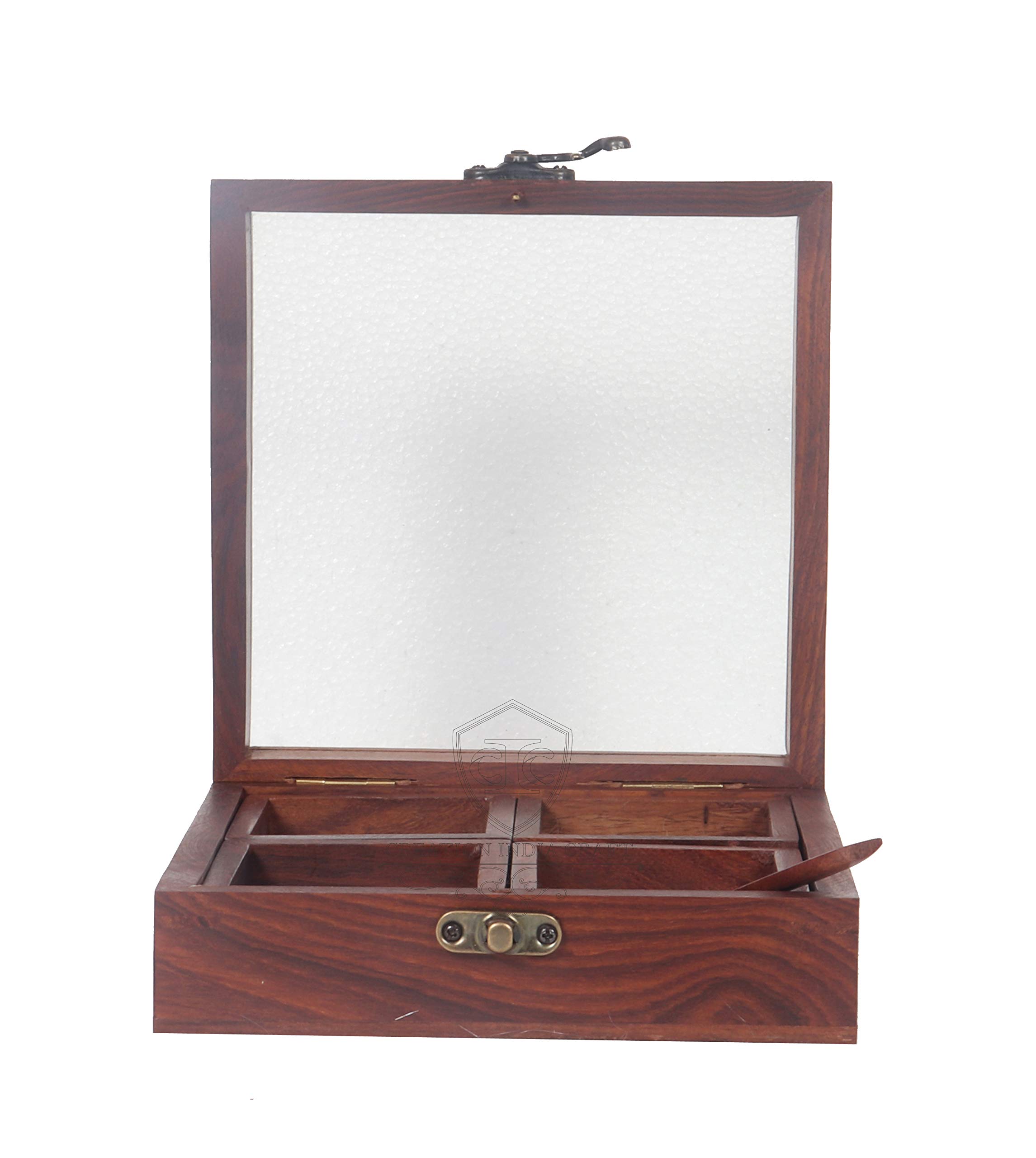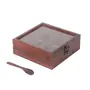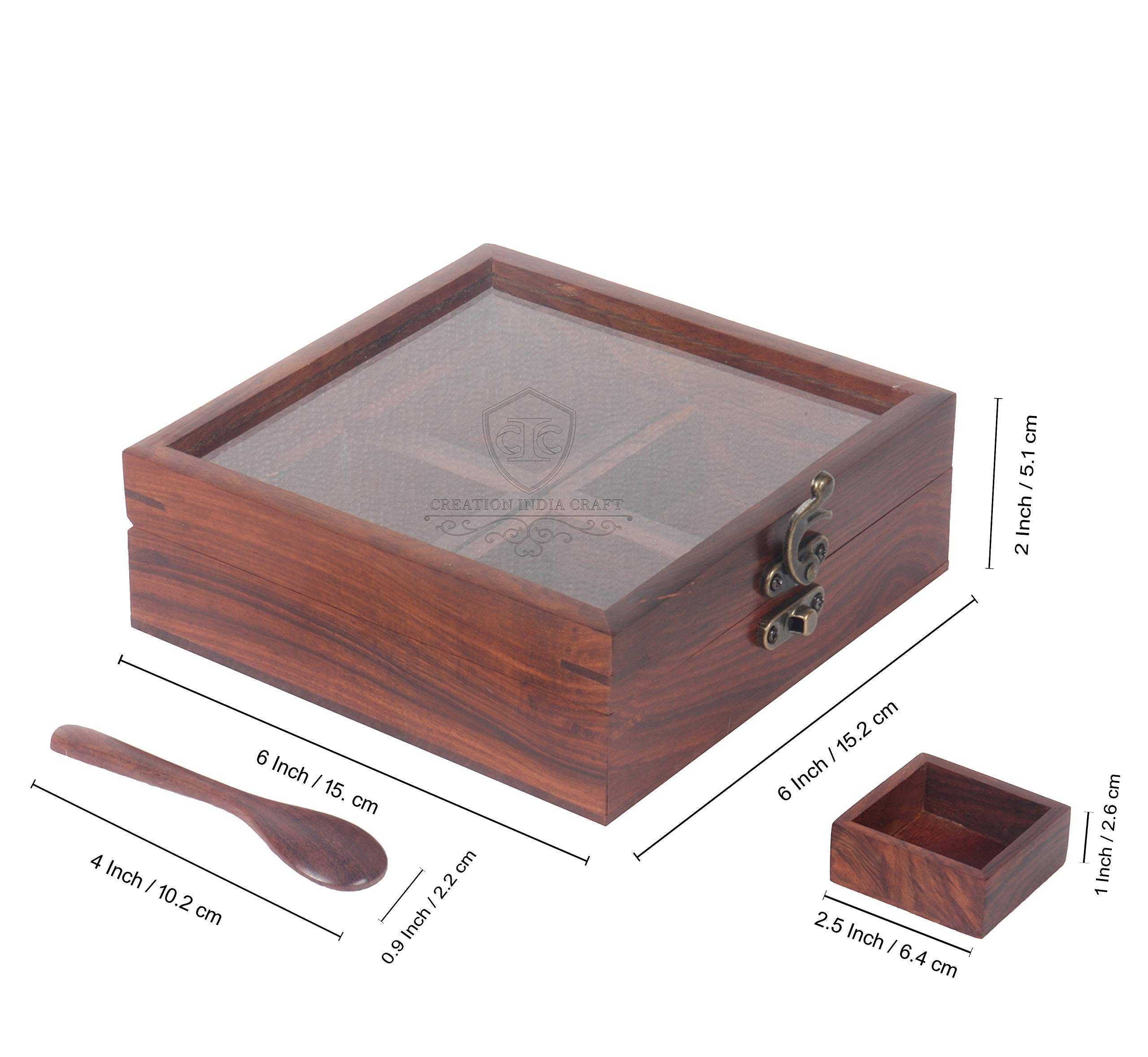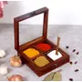 HomeFor DeletionWOOD CRAFTS OF RAJASTHAN Wooden Spice Box Masala Dabba Namak Dani Dabba With Glass on Top & Spoon Table With 4 Devided Jars 6x6x2 Inch Pack of 1 Brown