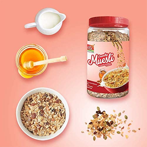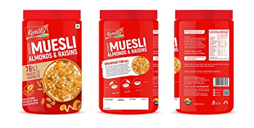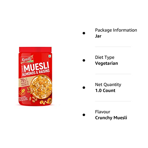HomeGroceryHealthy BreakfastOats & MuesliKwality Muesli Crunchy Almond Raisins and Honey Goodness of Multigrain High in Fibre Source of Vitamin Iron and Protein 1Kg Jar