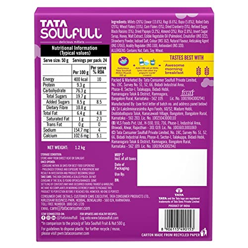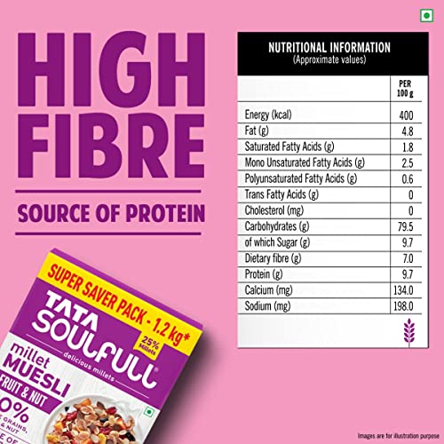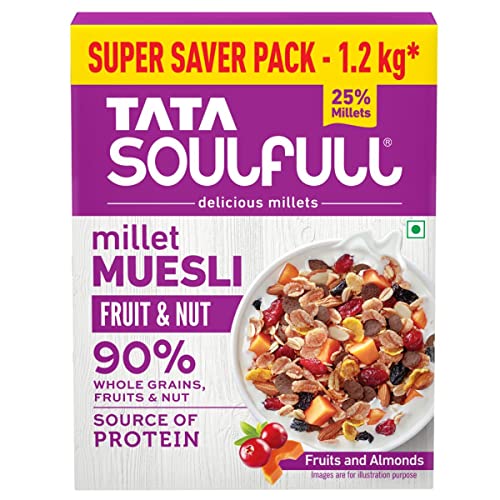HomeGroceryHealthy BreakfastOats & MuesliTata Soulfull Millet Muesli, Fruit & Nut, 1.2kg, 25% Delicious Millets, 90% Whole Grains Breakfast Cereal, Real Fruits & Almonds, High in Fibre, Source Of Protein