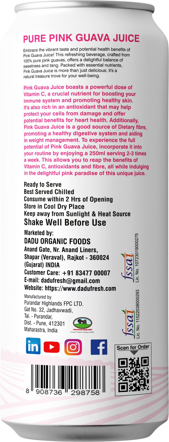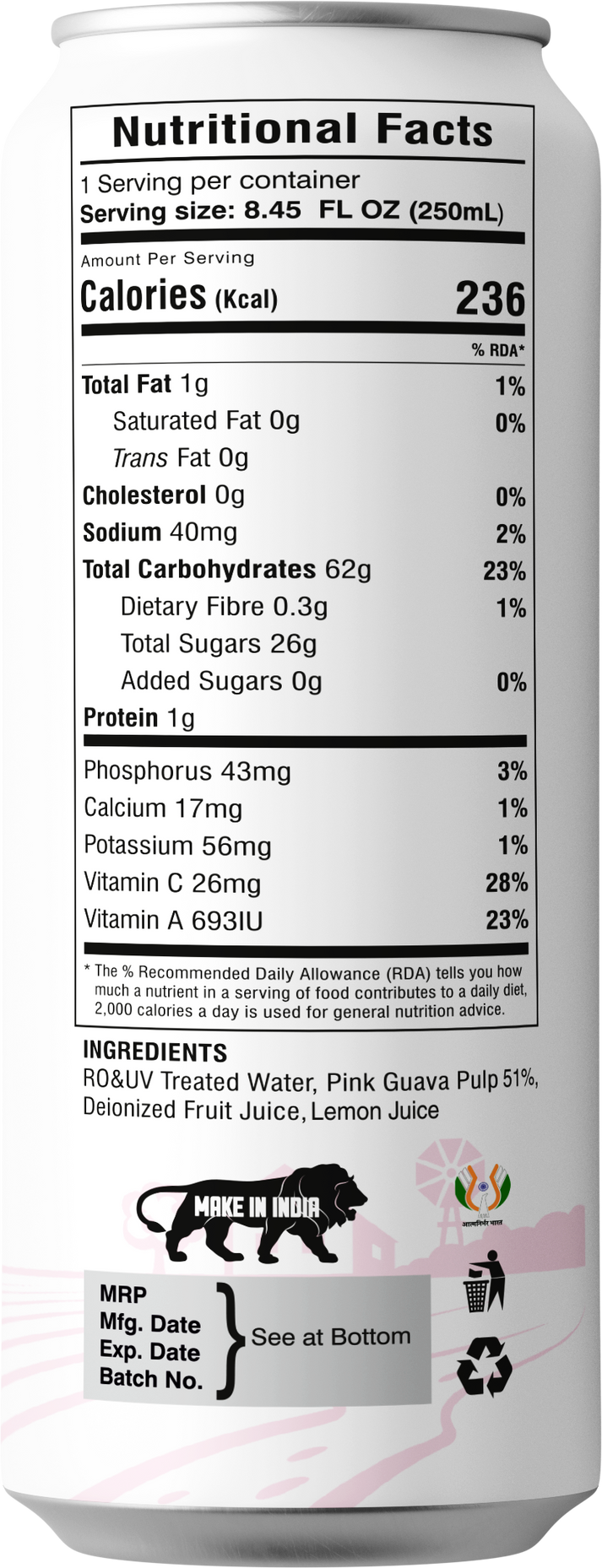Our Pink Guava Juice, crafted with RO & UV Treated Water, Pink Guava Pulp, Deionized Fruit Juice, and lemon juice, delivers a powerful dose of Vitamin C to boost your immune system and promote healthy skin.