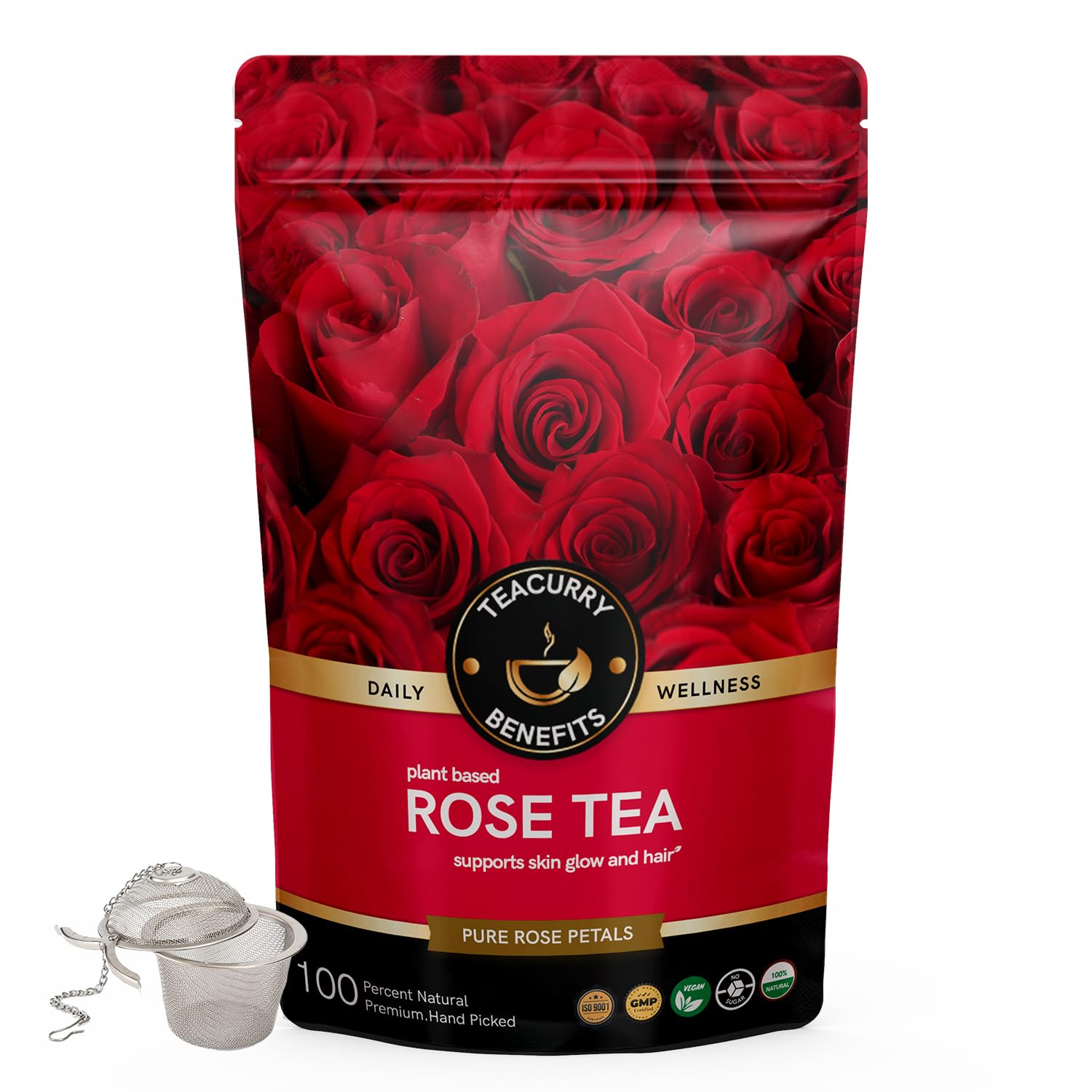 TEACURRY Rose Petal Tea (1 Month Pack 100 Grams) + Infuser - Helps in Skin Health Relaxation