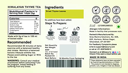100% Natural Tea Teacurry sources its ingredients from the best certified tea plantations and providers of herbs to ensure that our teas are of highest quality. All are ingredients and thyme dry leaves are 100 percent natural and does not contain any art