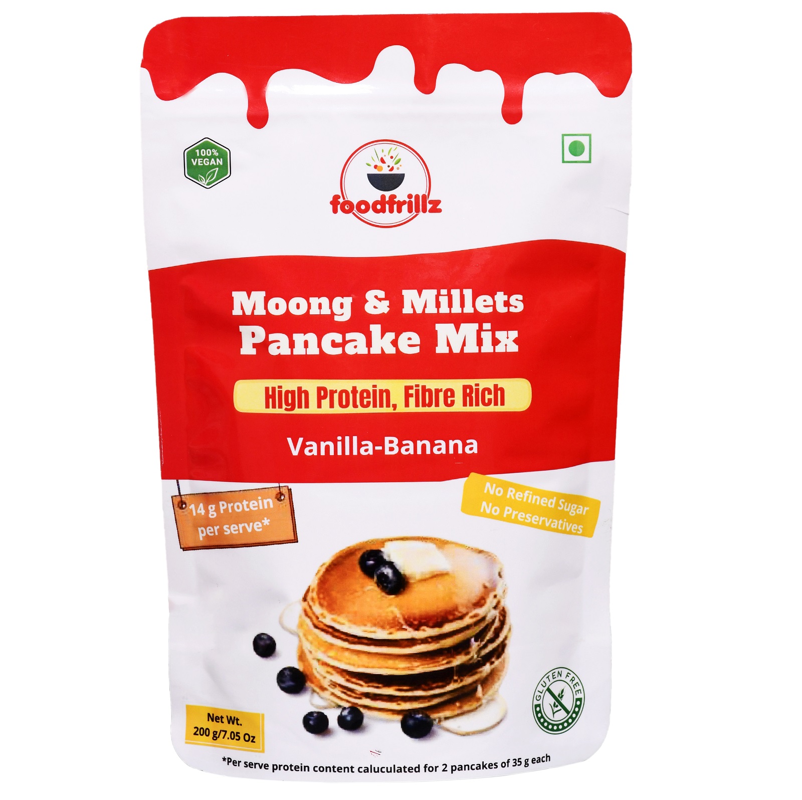 HomeGroceryCookingBaking SuppliesBaking MixesFoodfrillz Millet Delectable Delights: The Perfect Pancake Mix-Banana Vanilla Flavour Healthy Natural High Protein with Sprouted Moong Beans 200 g