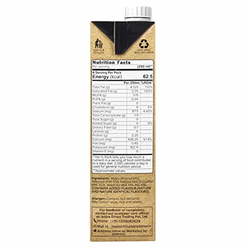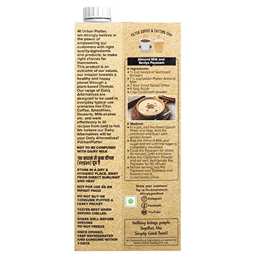 Urban Platter Unsweetened Almond Milk contains Premium Almonds from California and mountain spring water from the s.