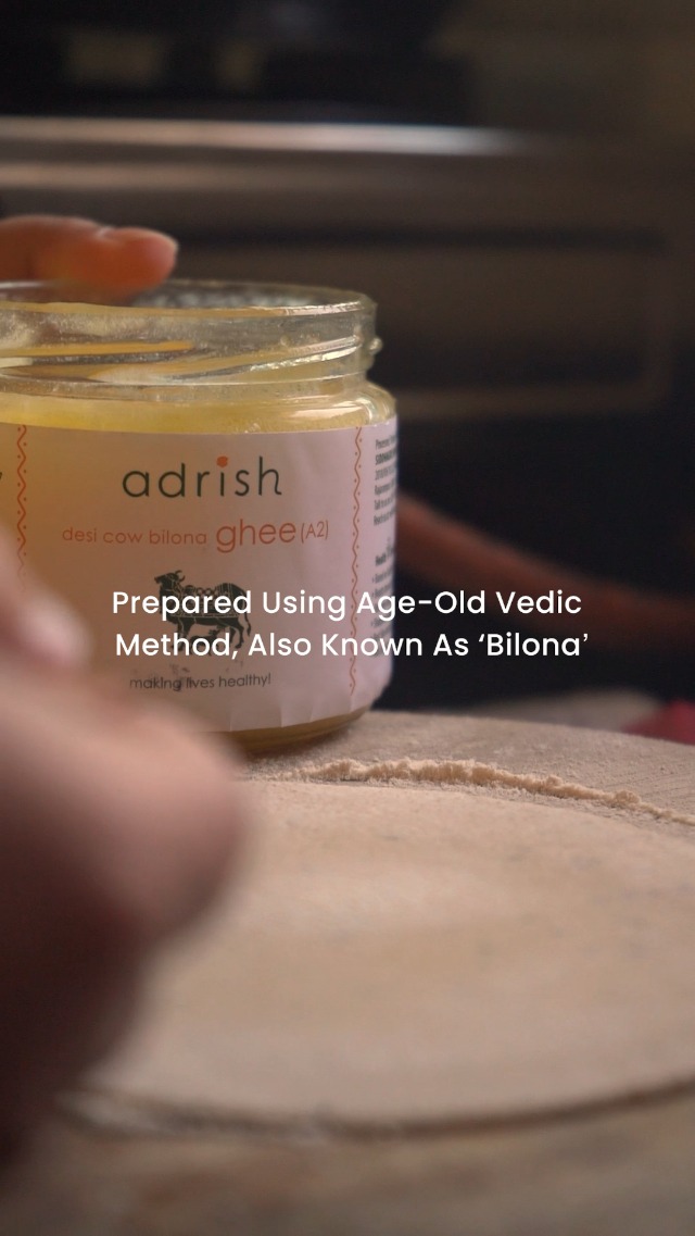 Adrish Desi Cow Ghee is prepared using age-old Vedic method also known as ‘Bilona’. It is made by warming the makkhan obtained from churning ‘Whole Milk Yogurt’ (entire milk is converted to curd & not just the cream) of desi cows.