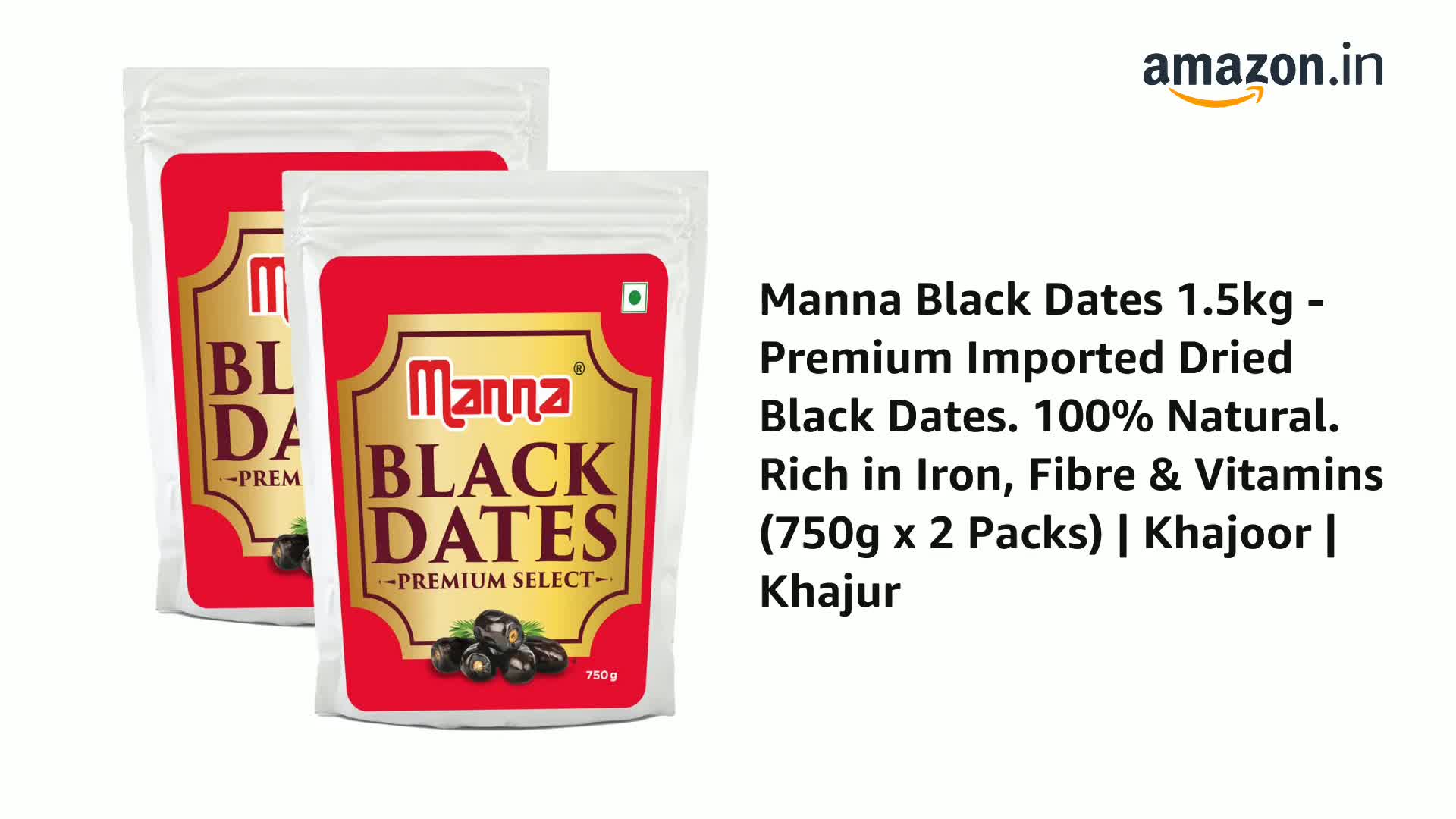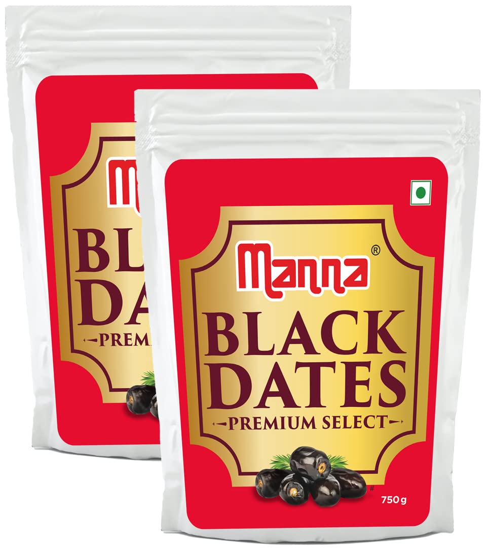 Manna Black Dates 1.5kg - Premium Imported Dried Black Dates. 100% Natural. Rich in Iron, Fibre & Vitamins (750g x 2 Packs) | Khajoor | Khajur