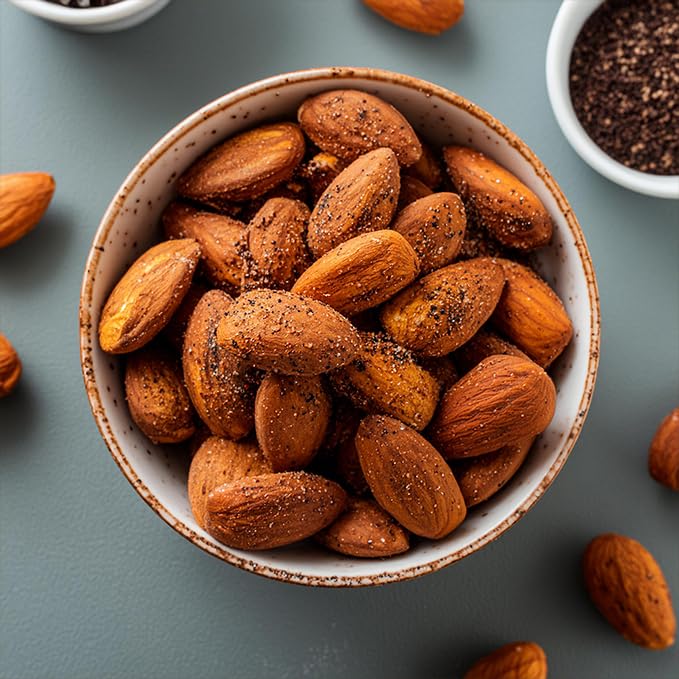 FLAVORFUL TREAT: A light dusting of black pepper adds just the right kick of heat to roasted almonds without overwhelming their natural nutty taste.