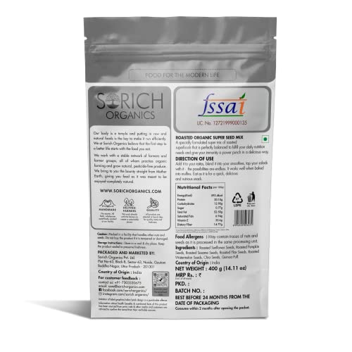 Sorich Organics Roasted Super Seeds Mix 400gm | Seeds Mix for Eating | Mixed Seeds for Management Hair Growth | High Protein Healthy Snacks | Diet Food | Vegan | Free