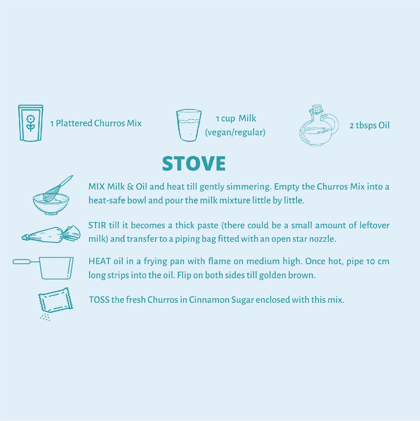 Instant Churros Mix: Enjoy freshly fried churros quickly just add Milk (Regular/Vegan) & Oil. Mix, Fry, Toss and Enjoy.