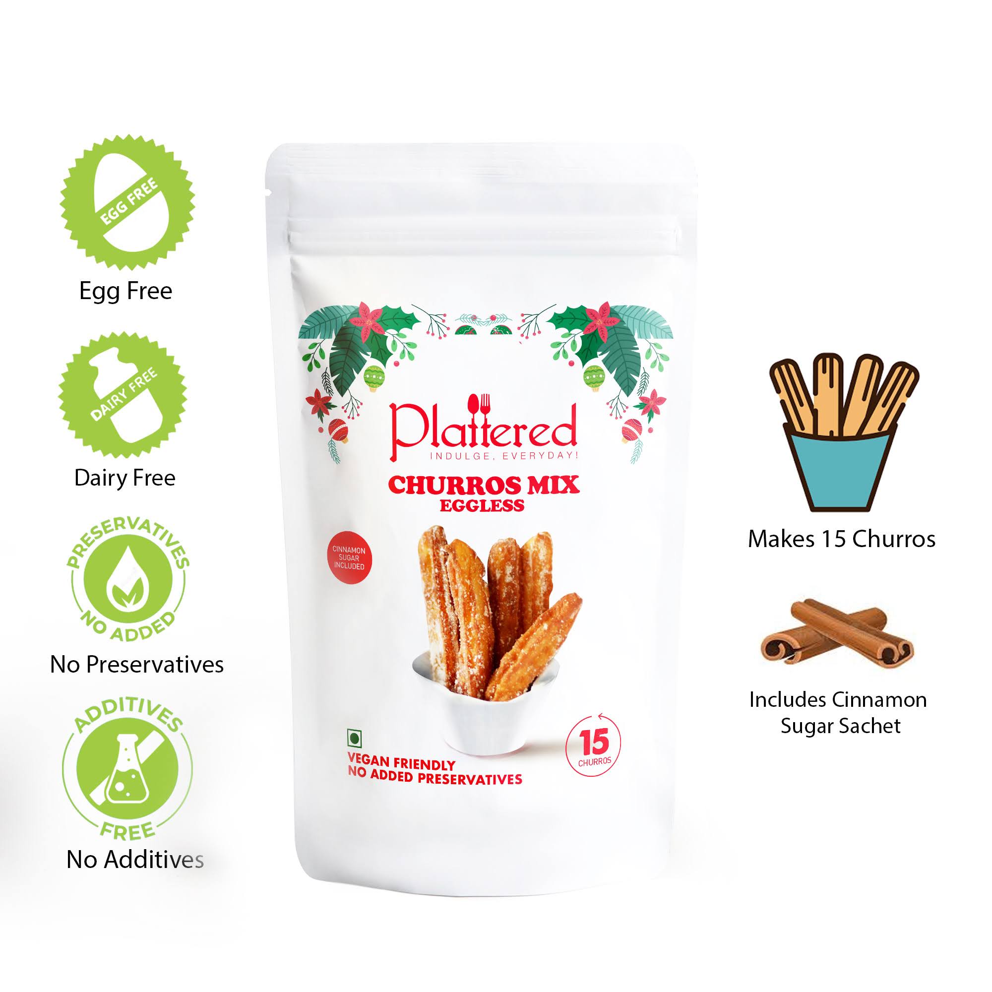 Plattered- Churros Mix 220 Gm with Free Cinnamon Sugar Sachet- Instant Dough Mix- Eggless, 3 Easy Steps Whisk, Scoop & Bake- Natural & Vegan- Pack of 1