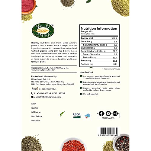 Millet Amma's Organic Millet Pongal has a millet content of over 58%. Made from Foxtail Millet and Moong Dal it is rich in fiber iron and proteins. It is easy to make and can be prepared in a matter of minutes.