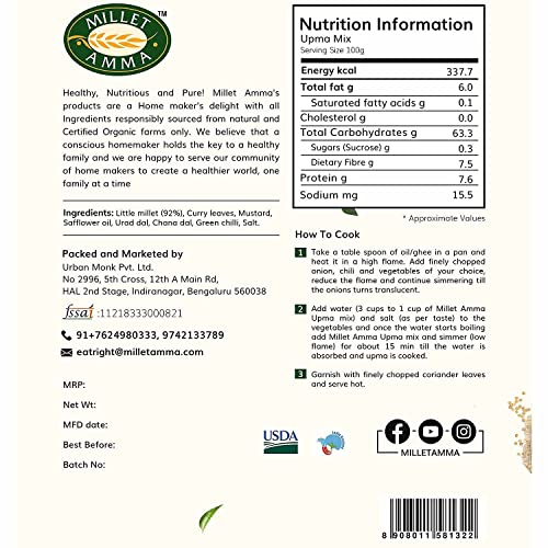 Millet Amma's healthy Organic Rava Upma Mix is a mix made with Little Millet Urad Dal and Chana Dal and is a family favourite.