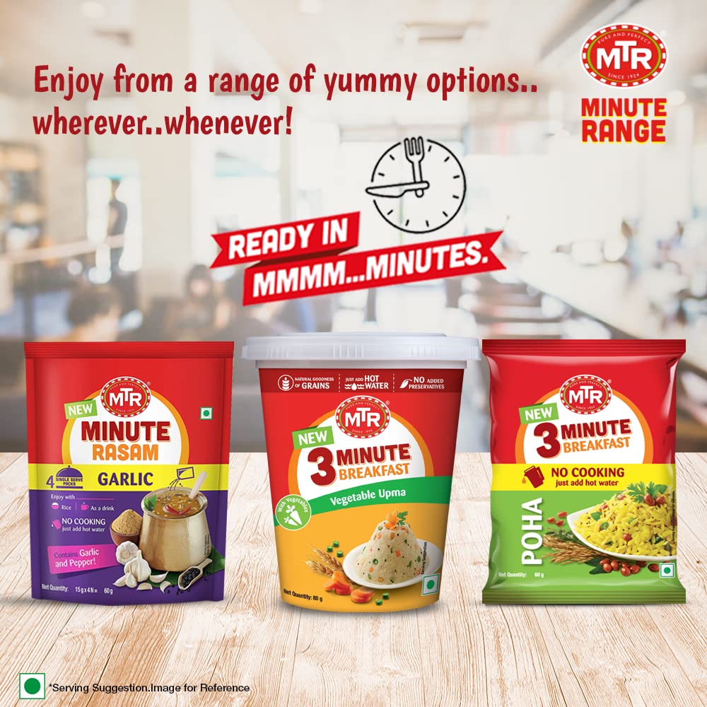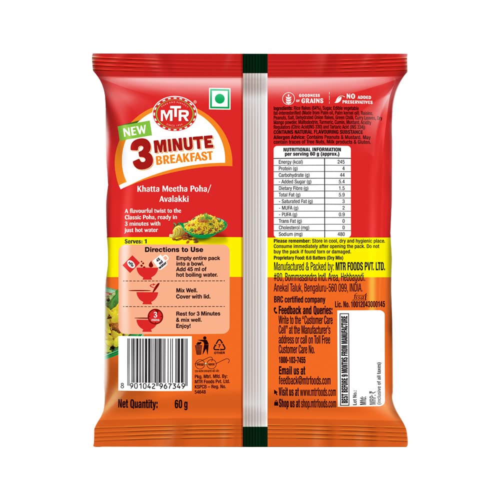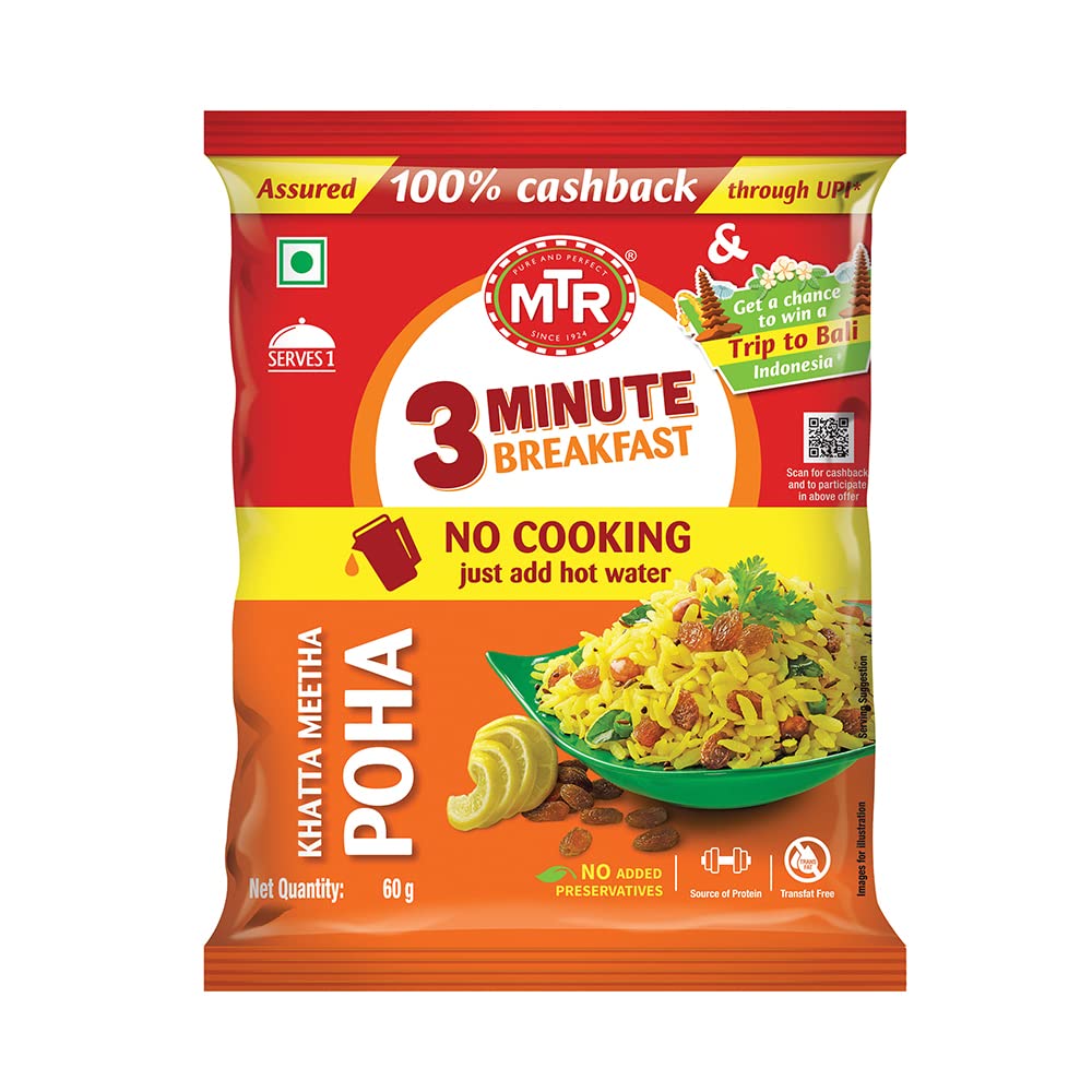 MTR 3 Minute Breakfast Khatta Meetha Poha | Just Add Hot Water | Wholesome Instant Breakfast | Tangy & Sweet Flattened Rice | No added preservatives | 60g Pouch